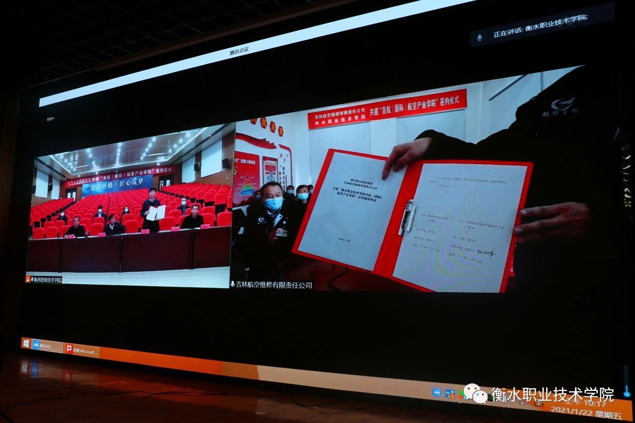 1月22日上午,衡水职业技术学院报告厅内,吉航(国际)航空产业学院云签约仪式在这里举行。衡水职业技术学院和吉林航空维修有限责任公司通过线上签约的方式,对共建“衡水职业技术学院吉航(国际)航空产业学院”的合作进行了深入交流,这标志着衡水市校企融合又迈上了新台阶。