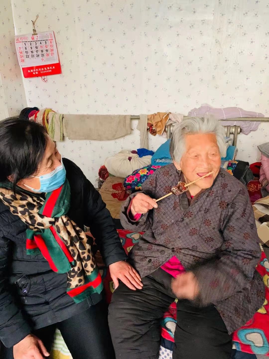 “她一顿能喝一碗粥、吃一个馒头和一个鸡蛋,吃大锅菜能和我吃的量差不多。”平日里,尚巧郡并不挑食,但是只要她提出来想吃什么,田自安就会立马给母亲准备。晚辈们也会给老人带些适口的零食。“俺这儿子就是人老实,给俺按摩、盛饭,这么多年了跟着他,俺是享福了。看俺身上的肉,可是不少哩。”说起自己的儿子田自安,尚巧郡眼圈泛红,眼神中充满了愧疚。这时候,田自安立马说道:“苦一起受,福更要一起享。”尚巧郡大笑起来。从年轻时候捡树叶吃到现在鱼肉随便吃,从住土坯房到现在住瓦房,从穿缝缝补补的衣服到随时可以买到新衣服,尚巧郡一生经历坎坷,饱受贫困、战争、饥饿之苦,如今在党的关怀下,生活也是有滋有味。尚巧郡逢人便说:“这日子要放在旧社会想都不敢想,是中国共产党和新中国给了俺们生活的希望。”按照国家规定,老人现在每年享受一定的生活补贴。