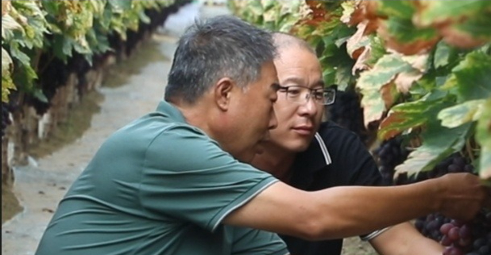 特聘农技员陈进忠(右)走进葡萄大棚直播授课。苏亚伟 摄