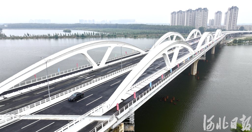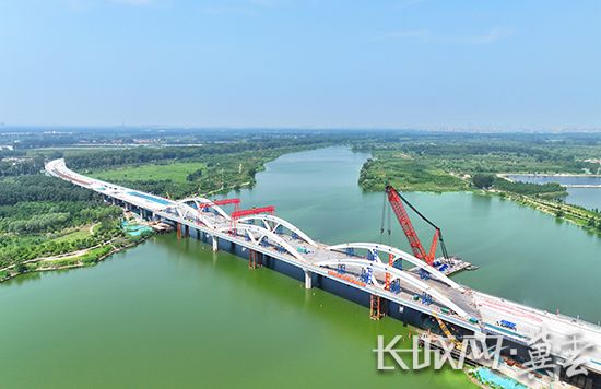 白沟河特大桥是京雄高速河北段北京进出雄安新区的门户桥梁。桥梁全长约1.76公里,主桥仿颐和园17孔桥造型,共设17孔,每孔长91米,建成后将成为我国规模最大的上承式钢箱连拱桥。桥梁主体工程已于去年底完成,当前进行的工程是桥面混凝土铺装。