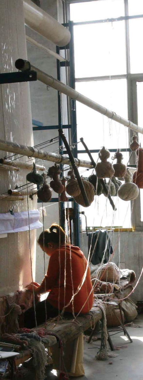 地毯的织做方式花样繁多,其成形和后序处理也非常复杂。一块地毯要经过:选料、图案、染线、合线、捞线、织作、半修、平毯、扫边、片毯、洗毯、清投、整理 13 道大工序和 86 道小工序,通过精工细作才能完成。其中地毯制作的四道主要工序是图案、染线、织毯、水洗。图案设计是每块地毯的灵魂,根据用户的需求,设计彩稿、放大、描图,图案纹样文化底蕴浓厚,丰富多彩,艺术风格多样。传统图案的主要代表纹样有八吉祥、四艺、龙凤等;现代图案代表纹样有山水、风景及抽象、模糊印象。经过不同颜色丝毛的交织,在深沉、典雅的图形上各具风姿,或素雅清秀,或古色古香。染线主要采用同媒染色法、后媒染色法和快速着色法进行环染和段染,坚牢色艳,工艺繁杂。织毯是地毯的成形工序,决定着整块地毯的内在质量,即根据图案纹样的要求采取多种形式编织技法,掌握“平、顺、短、齐、地”织作要领,毯面平整形象逼真,毯基挺实或柔软,经久耐用。水洗是将绿色环保洗涤液剂溶解水,经水洗和多遍次顺洗、呛刮,将地毯表面绒头打开,产生光泽和质感,使毯面弹性强、色泽艳、手感绵软、洁净、光亮。