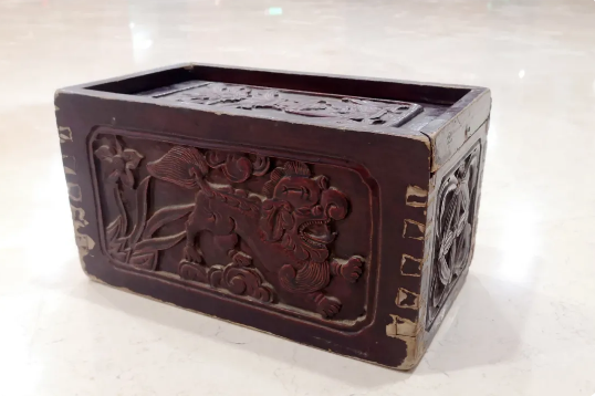 这个书信箱长30.5厘米,宽17厘米,高16.3厘米,外围有手工雕刻的精美图案——箱盖刻有一束在花瓶中盛放的牡丹,箱前后两面对称刻有两头狮子,狮子朝向的信箱右侧面刻有绣球,和绣球对应的另一面刻有两支梅花。