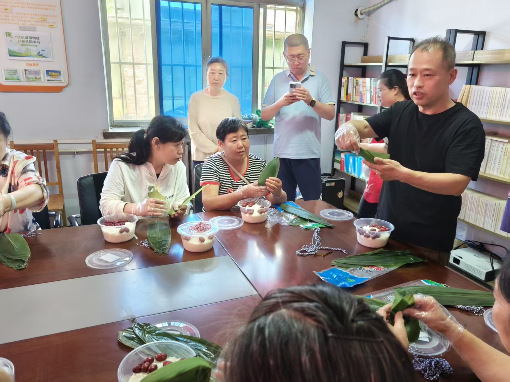 活动现场,一片其乐融融。有的在准备包粽子的食材,有的已经开始在包粽子了。尽管有些人包粽子的手法不熟练,但每个人的热情非常高涨,有经验的在认真地教初学者有关包粽子的技巧,他们通过互相帮助,互相指点,转瞬间,一个个形态各异、棱角分明的粽子便呈现出来。