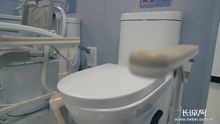 你看,这个马桶旁边比我们日常所用的多了一些安全扶手等设施,这是为方便老年人专门定制的。