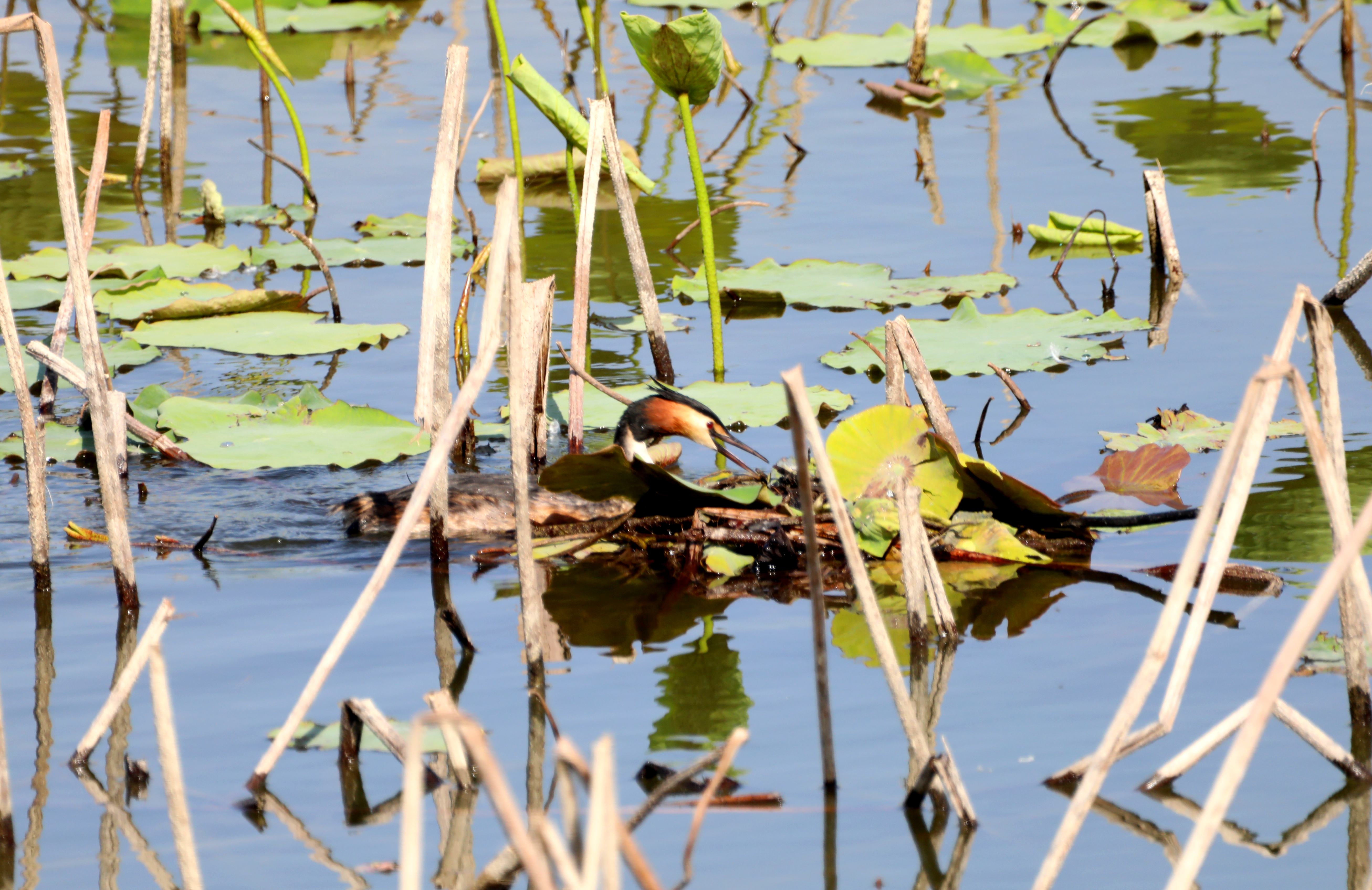 经过一系列的仪式之后,两只凤头䴙䴘共同生活的序幕就此拉开。它们把爱巢建在水面上,以水生植物的叶茎为主材的巢在水面漂着。巢里的湿草发酵会产生热量,有助于鸟蛋的孵化。小鸟儿破壳而出后,两只亲鸟轮流为孩子捕鱼,双亲还会把雏鸟驼在身上,在水上游弋,把爱情大戏换成温馨而快乐的亲情时光。它们的恋爱季迎来了大结局,也再一次成为湖上的风景,成为摄影师最爱的素材。凤头䴙䴘“恋爱季”里这一整套非常具有仪式感的表演,是当之无愧的小戏精呀。