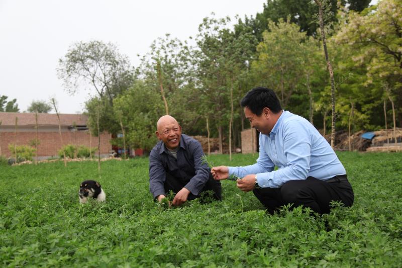 建桥乡东倪庄村种植户在查看旱作雨养谷子长势情况。苗凤强 摄