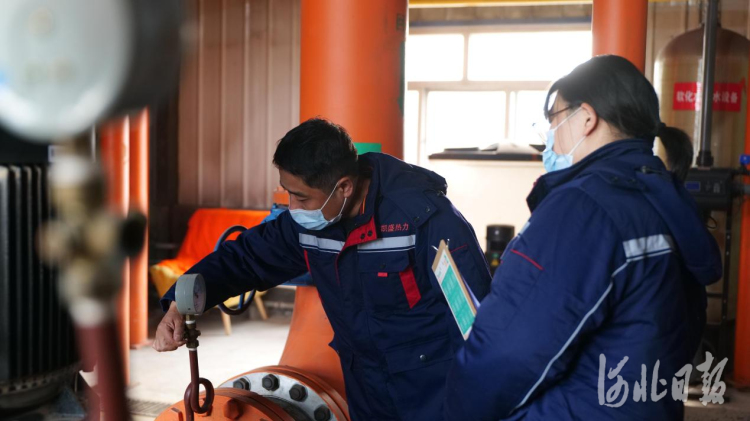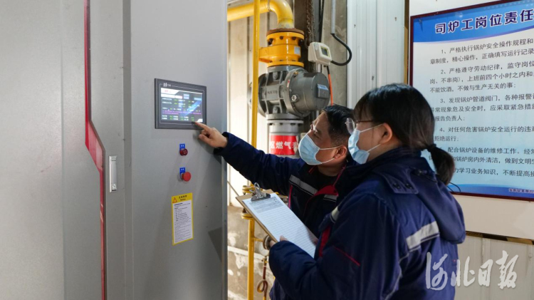 11月3日,在安新县凯胜佳苑小区燃气锅炉房,安新县寰慧凯盛热力公司技术人员对锅炉燃气表、循环泵压力表等关键环节进行检查。 河北日报记者李佳泽摄