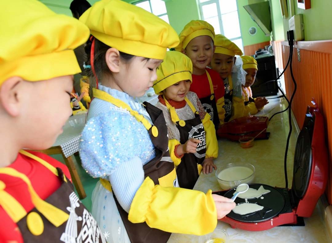 幼儿园老师及孩子家长提前采购了羊肉卷、蔬菜、水果等丰富食材,准备了电饼铛、碗筷等用具。老师带着孩子们动手制作了蛋挞、华夫饼、橙子茶等美食,孩子们学习了如何择菜、洗菜,锻炼了动手能力。