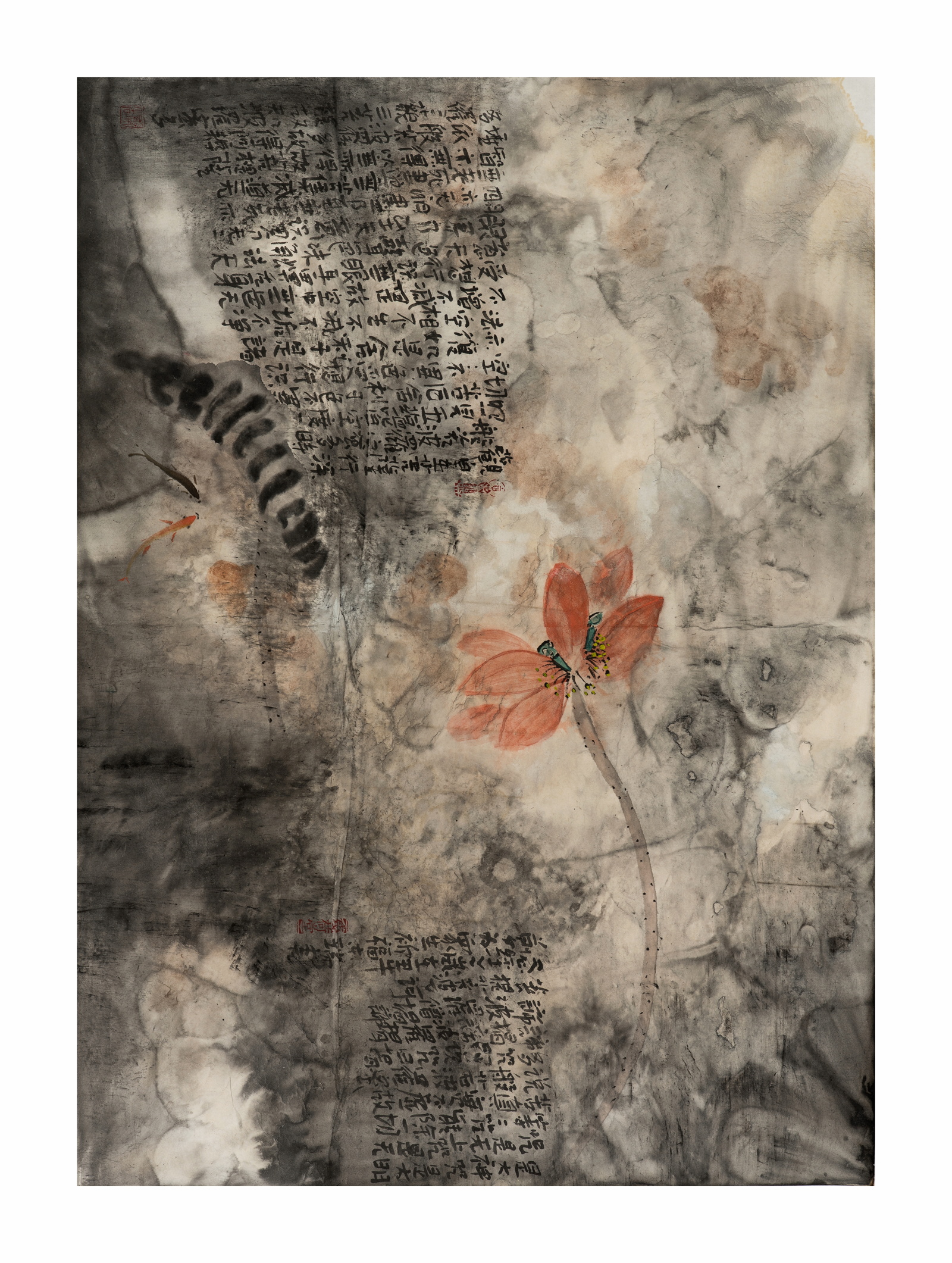 画家在花鸟作品中融入山水的画法,在点线之间融入光影留白,让莲花有了神性,这种自由的表达直指画者心性,是谓“出尘”。