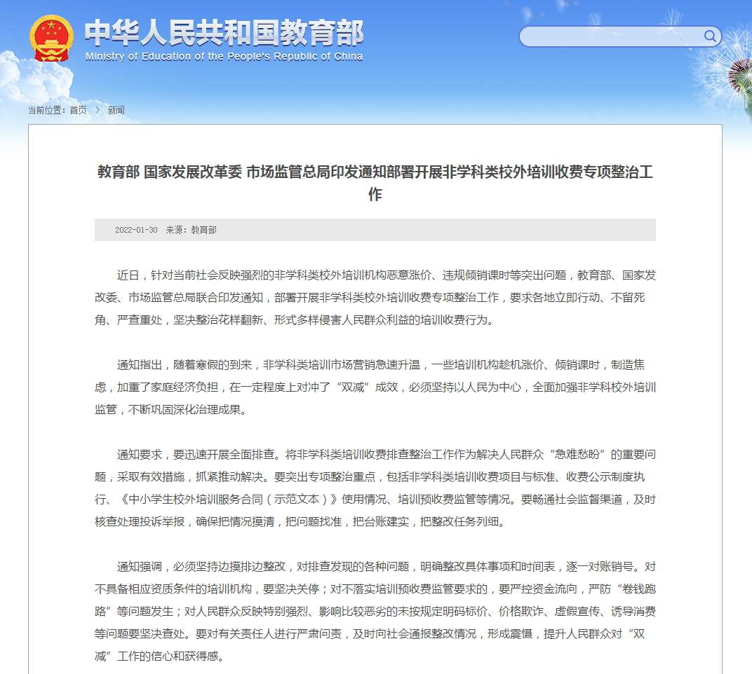 通知指出,随着寒假的到来,非学科类培训市场营销急速升温,一些培训机构趁机涨价、倾销课时,制造焦虑,加重了家庭经济负担,在一定程度上对冲了“双减”成效,必须坚持以人民为中心,全面加强非学科校外培训监管,不断巩固深化治理成果。