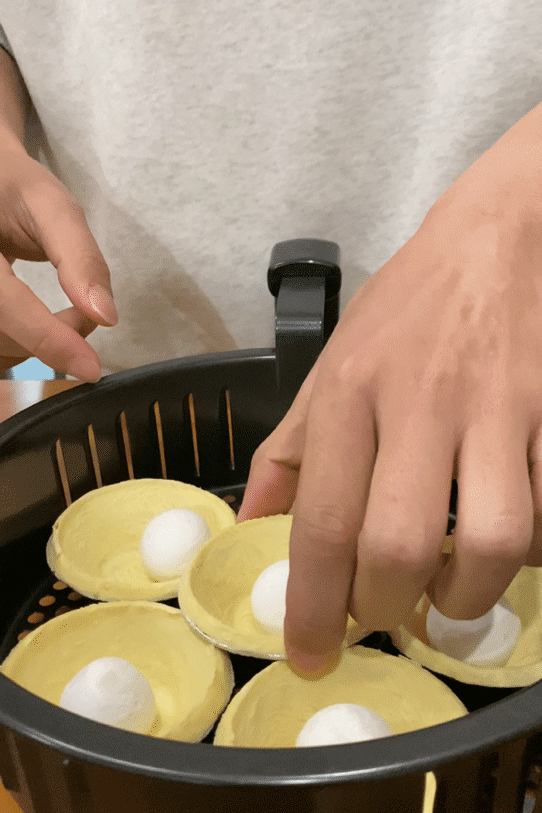 接着放入空气炸锅,180度,烤20分钟左右,也可以用烤箱制作。因为每个空气炸锅或者烤箱的温度不一致,所以中途观察一下,表面金黄酥脆就可以了。