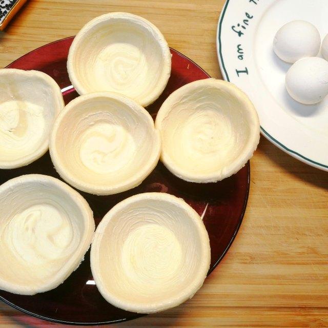 食材:汤圆、蛋挞皮、蛋液、黑芝麻。