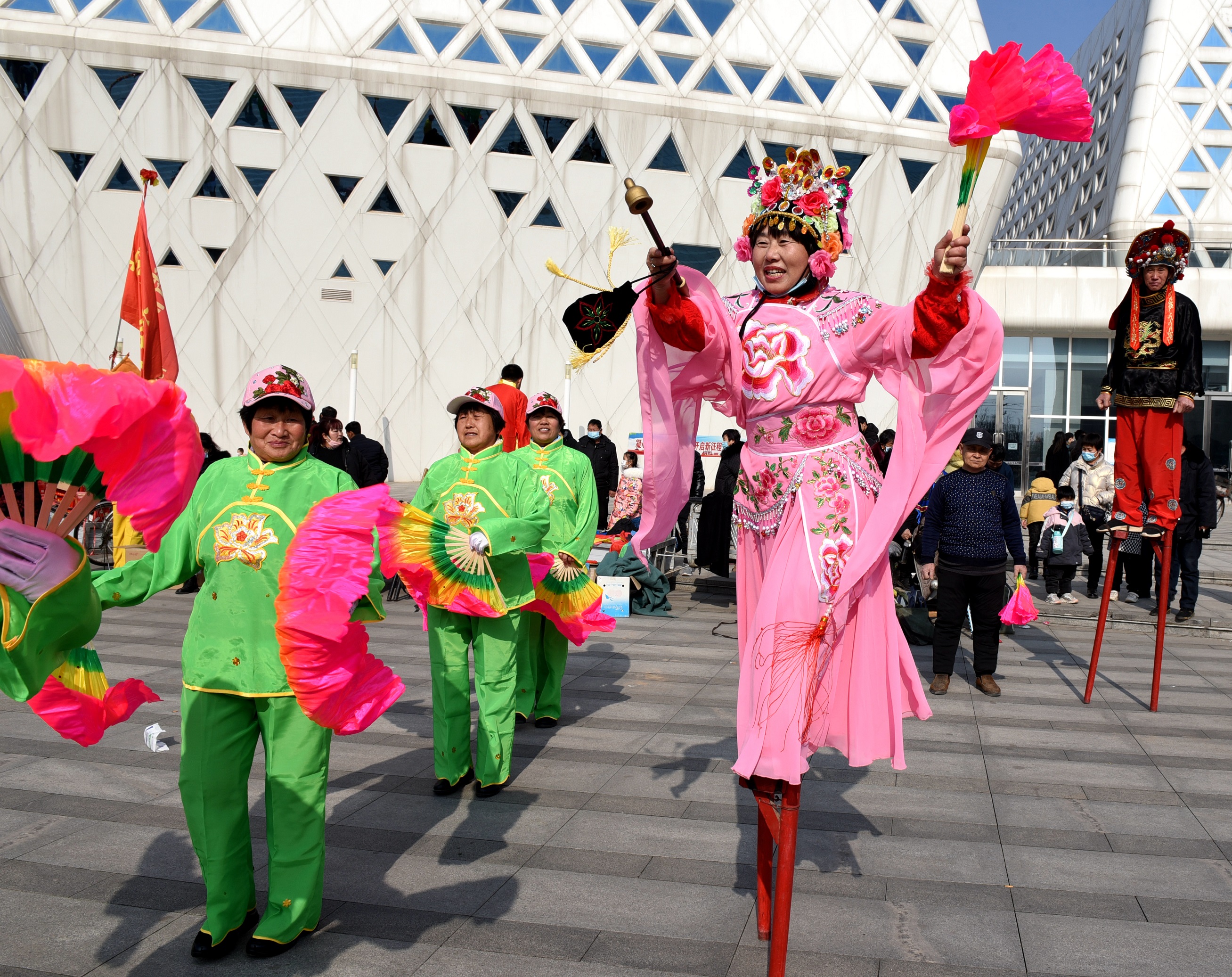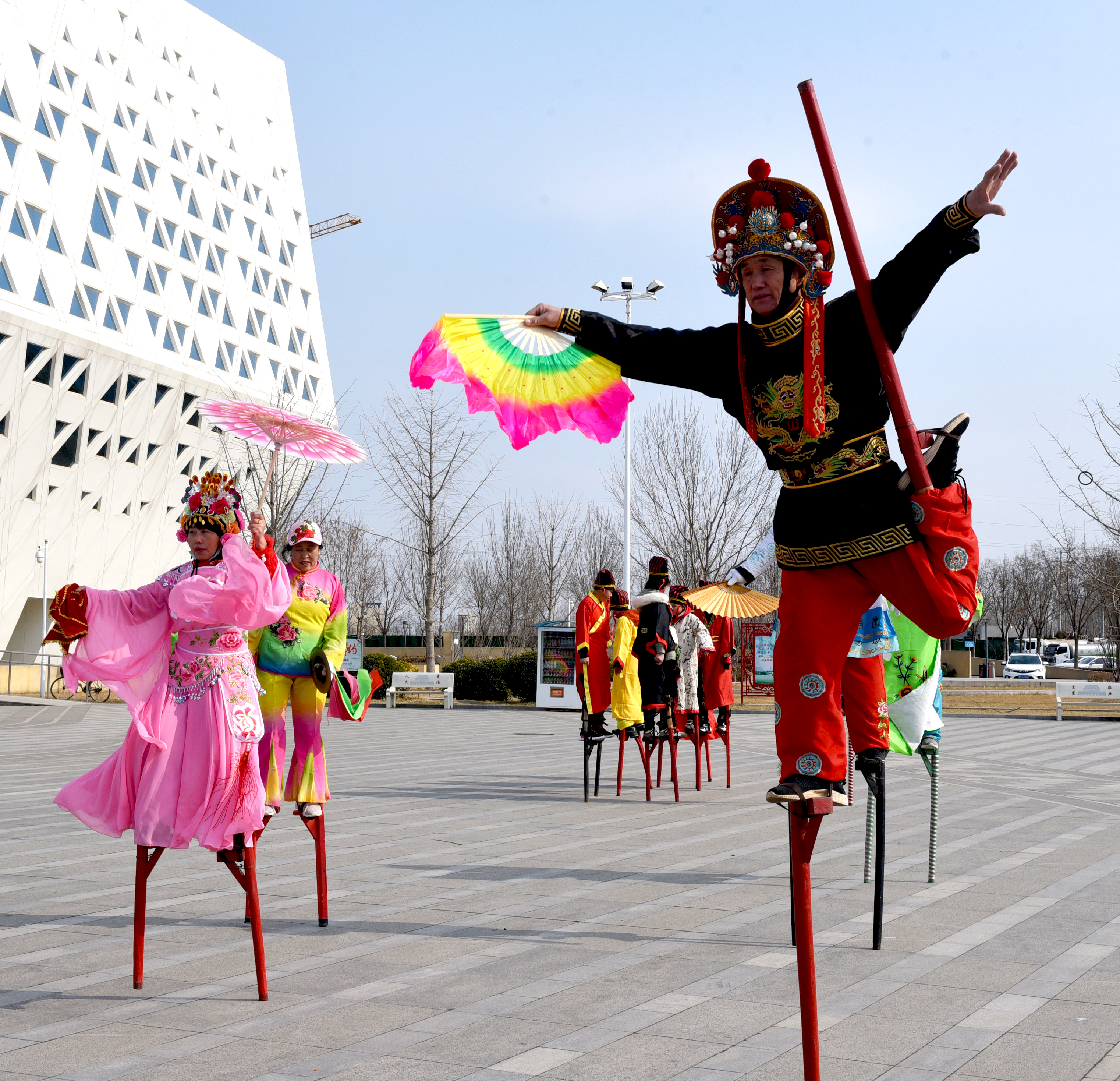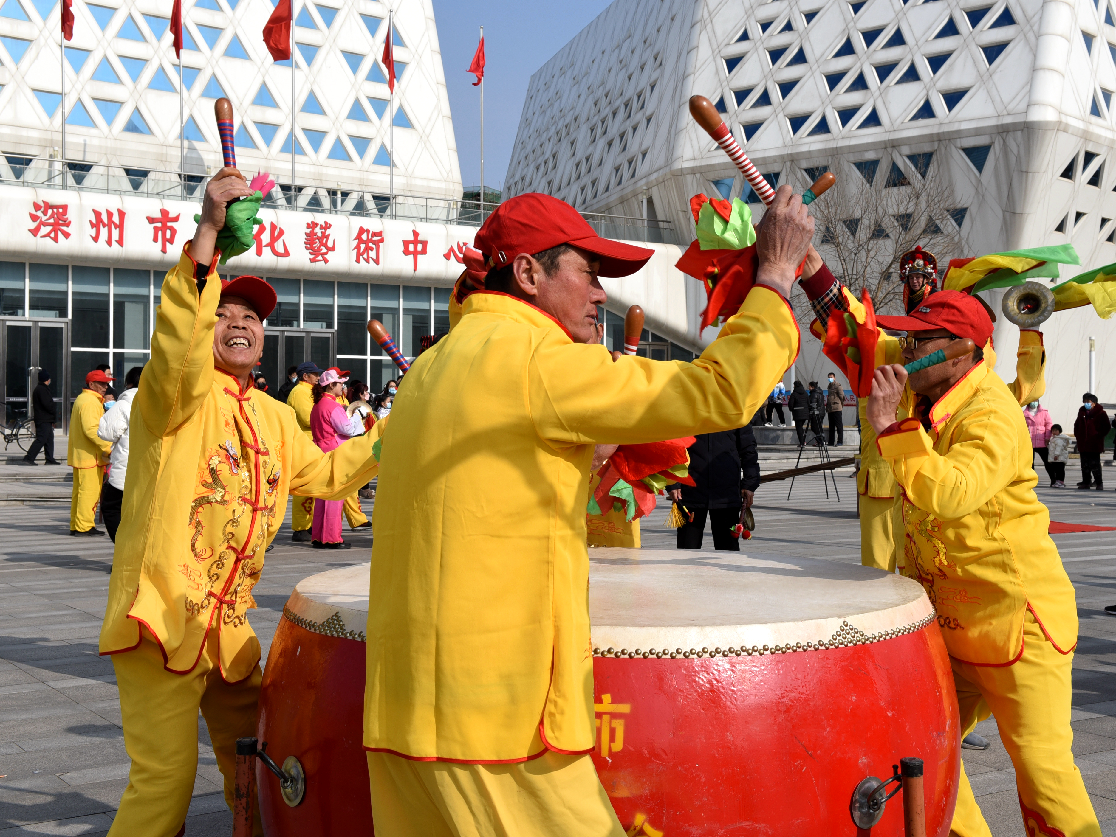 深州镇北街高跷队率先登场,大家身穿戏服,手拿道具,踩着约1米高的高跷列队行走,竟如履平地一般稳健自如。接下来,锣鼓、空竹、秧歌、划旱船、广场舞等民俗展演依次登场,民俗爱好者们献出各自拿手的绝活儿,各显神通。
