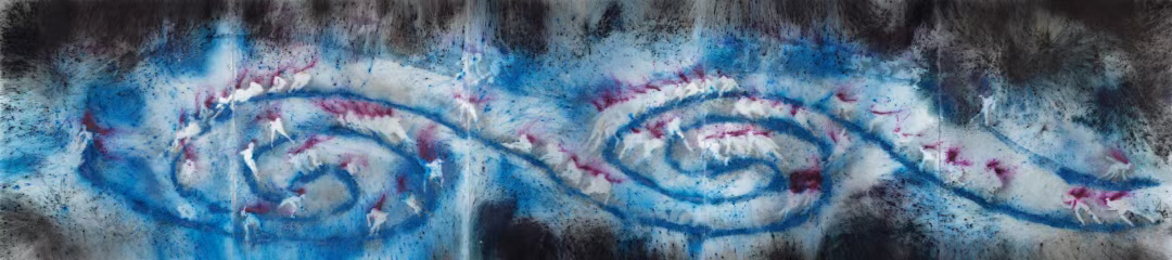 在《银河嬉冰》中,蔡国强把《冰嬉图》的背景置换为银河系,以玻璃和镜面代替画布,用这种特殊材料把“冰嬉”的主题表达得淋漓尽致。冰与火这对冲突的元素也因此在这幅作品中神奇地共生。