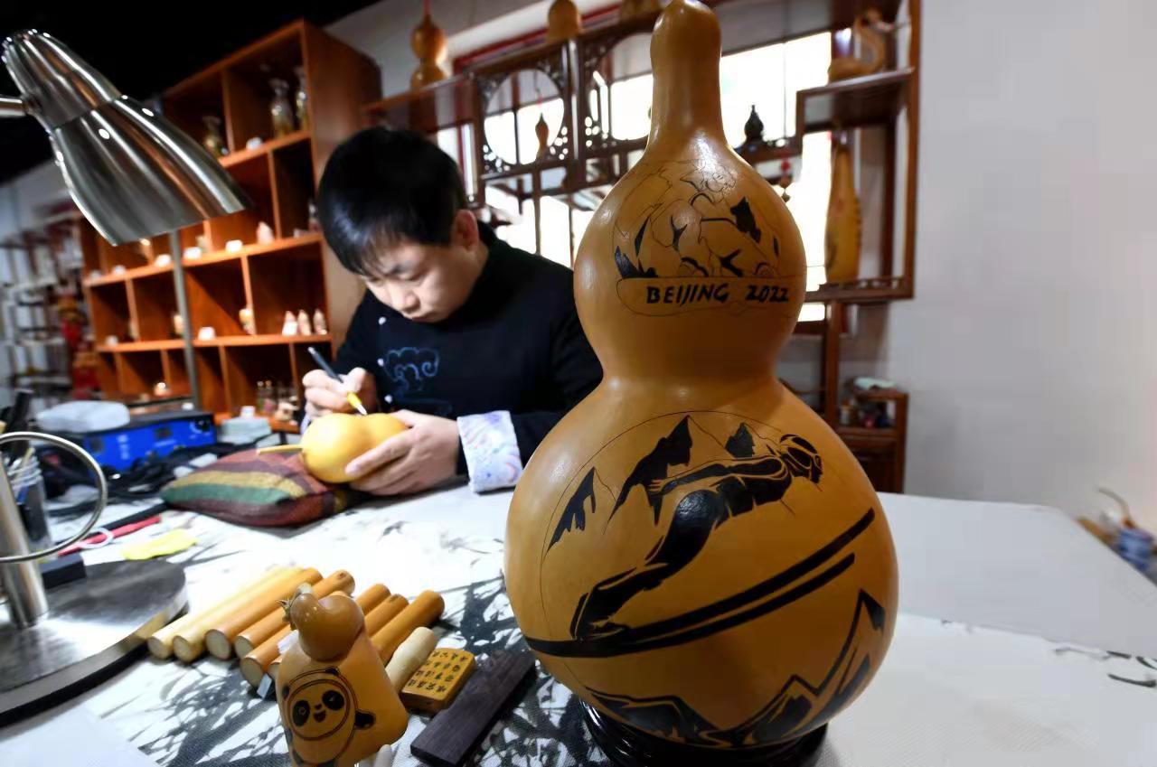2月19日,衡水市饶阳县葫芦烙画艺人王凯正在创作以冬奥为主题的葫芦烙画作品。自北京冬奥会开幕以来,王凯将自己擅长的葫芦烙画与冬奥相结合,创作了系列主题作品。据介绍,葫芦烙画是一种传统工艺,通过烫、熨、刻等技巧在葫芦上作画,具有独特的艺术风格。
