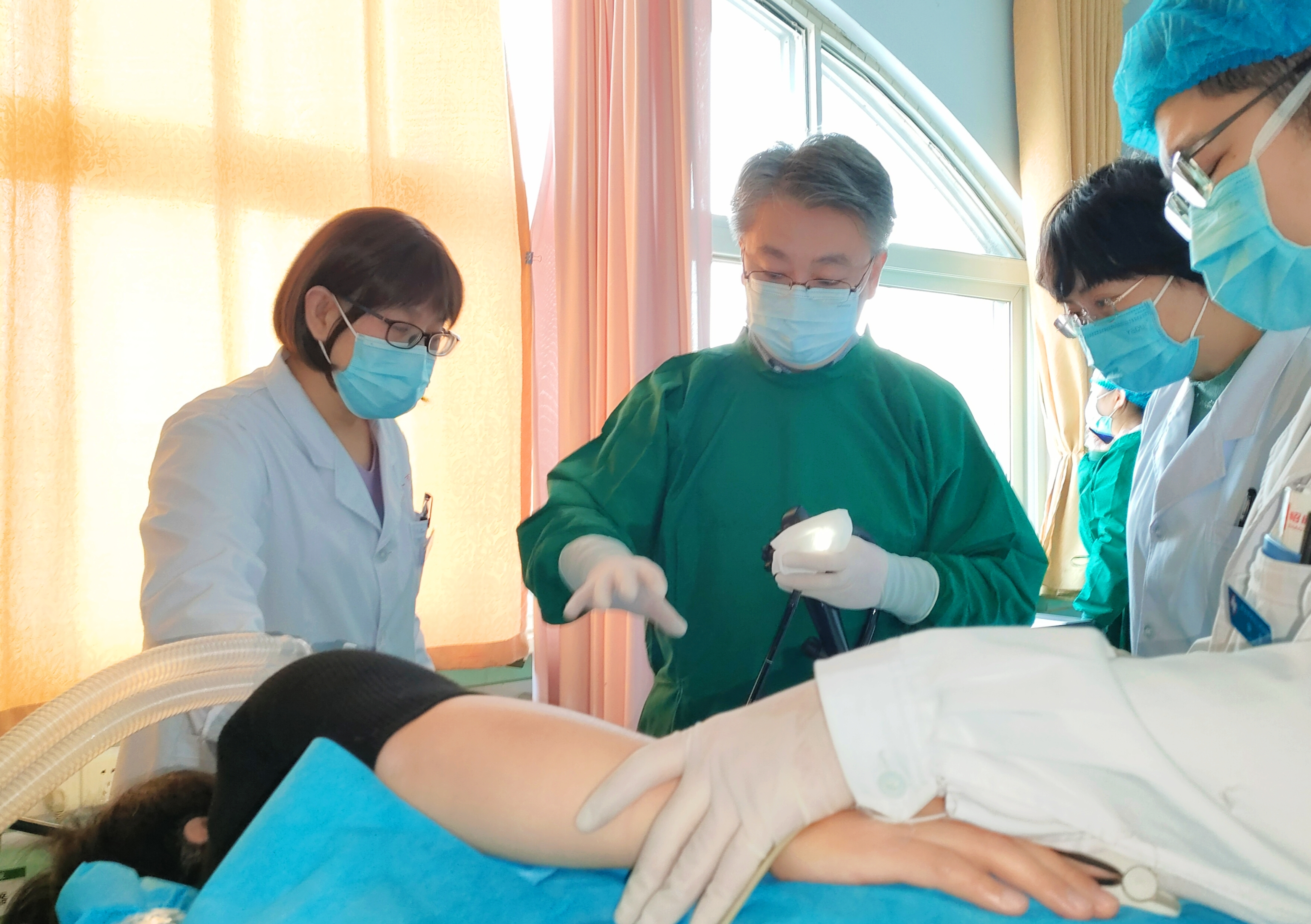 于卫芳教授(中)在临床操作中为五院内镜室医务人员传授经验