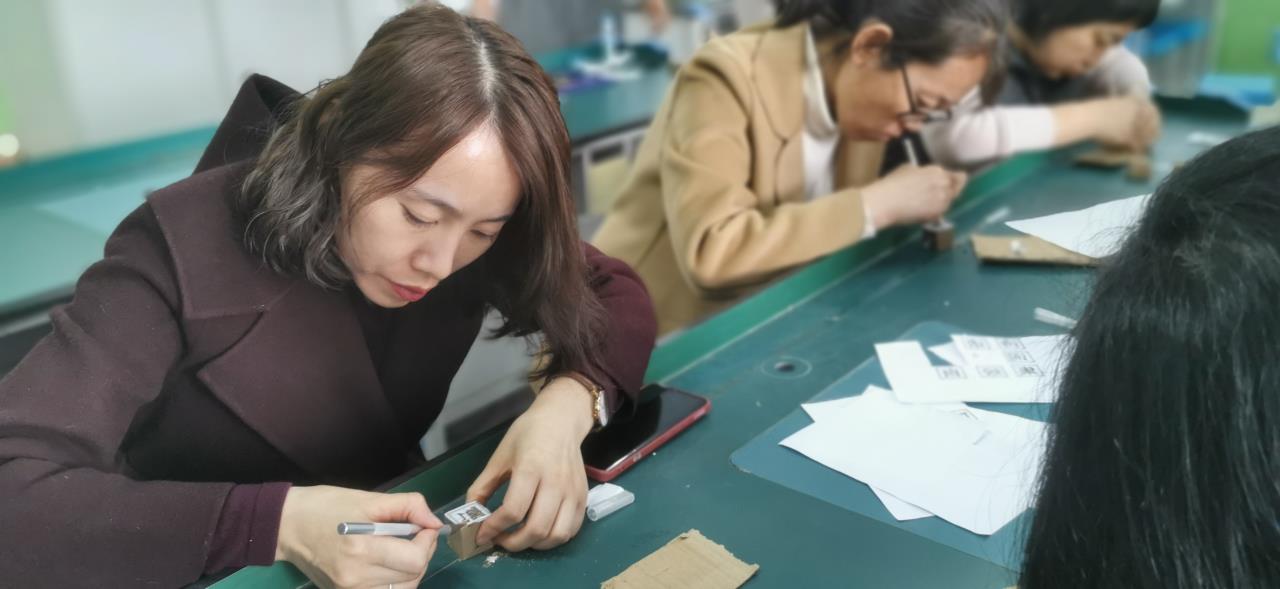 手作环节,在专业老师的指导下,教师们现场亲手拣字、排版、手工印刷,制作“平语”诗集。停留在课本书中活字印刷术,变成了鲜活的、看得见的、摸得着的、与时俱进的传统文化,从陶器拍印、盖印封泥、模印砖瓦再到活字排版印刷,制成“平语”诗词读本,教师们在亲身实践中感悟育人的初心和文化传承的使命。