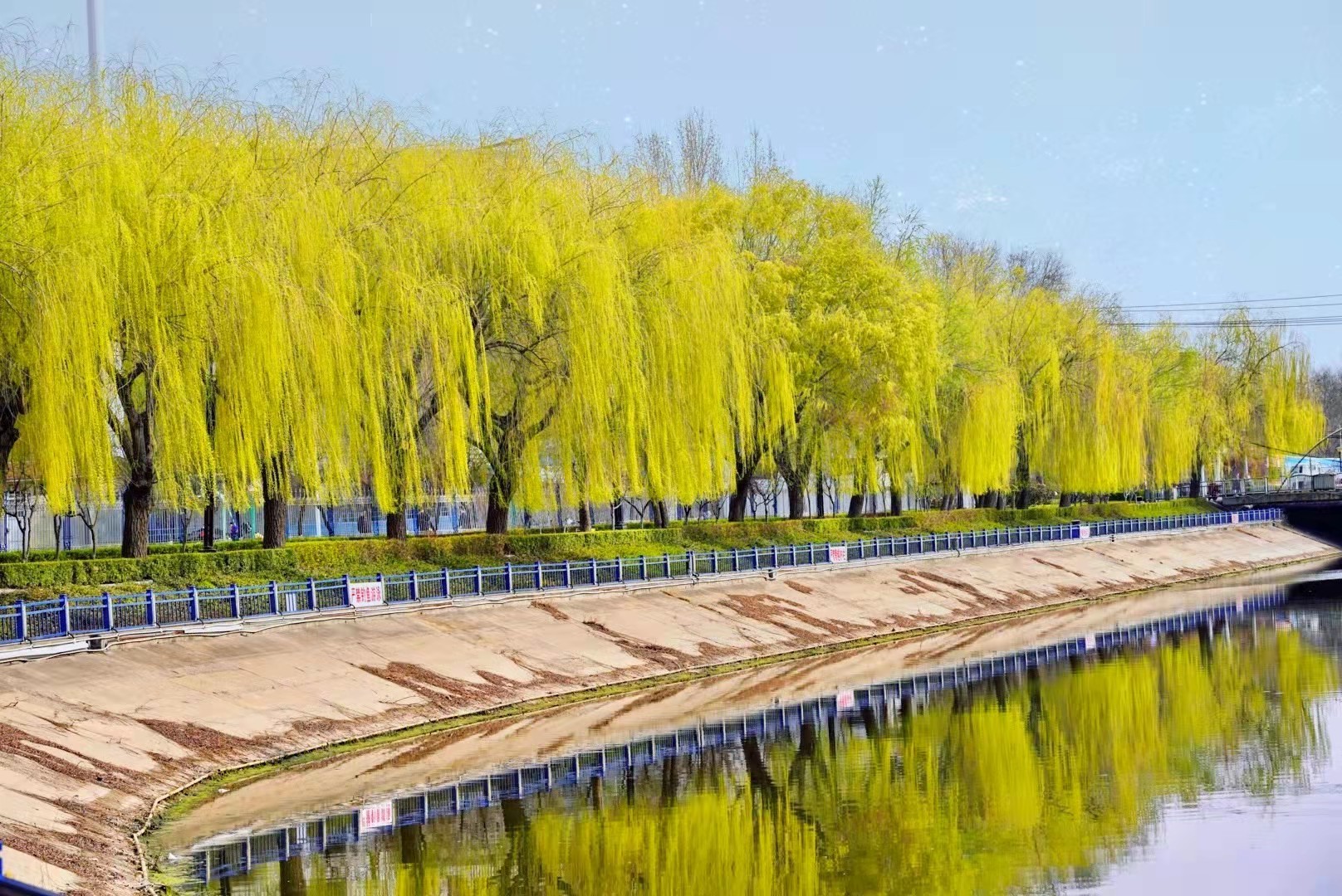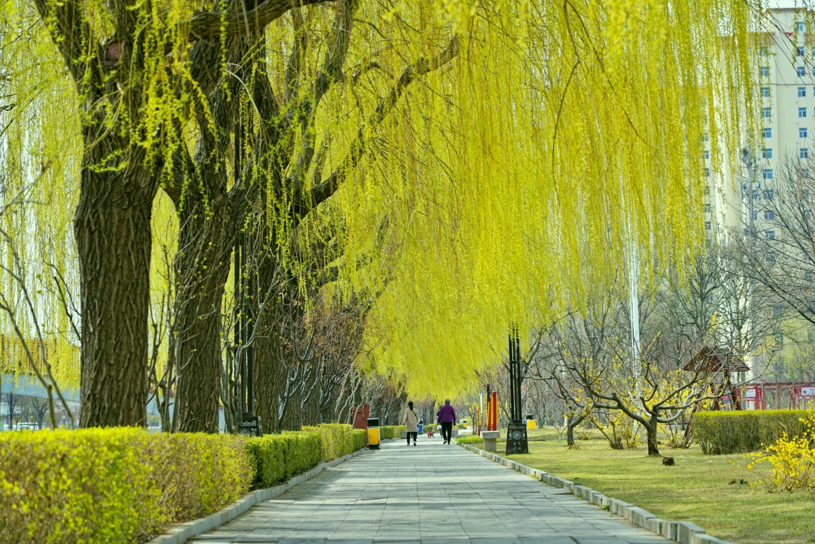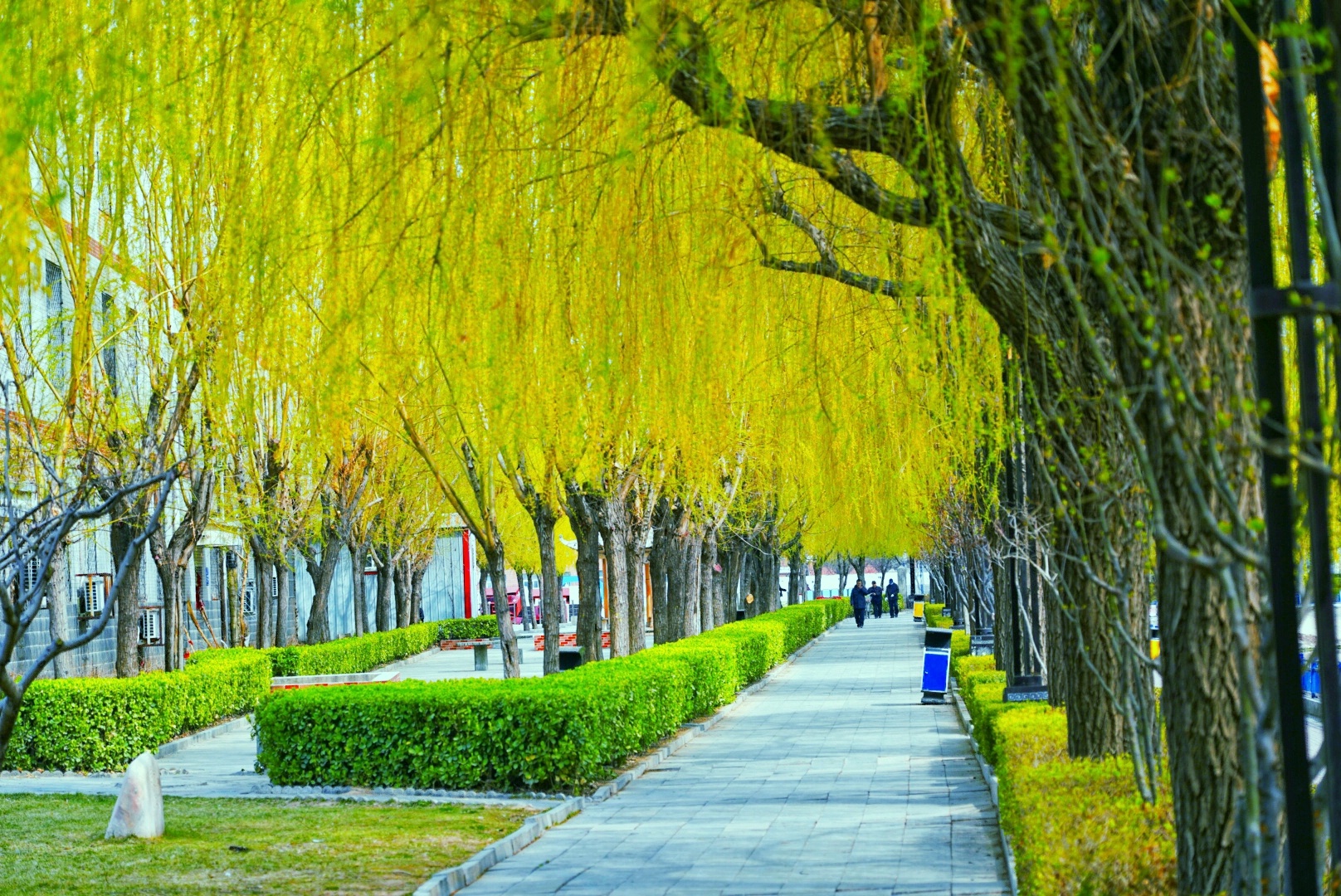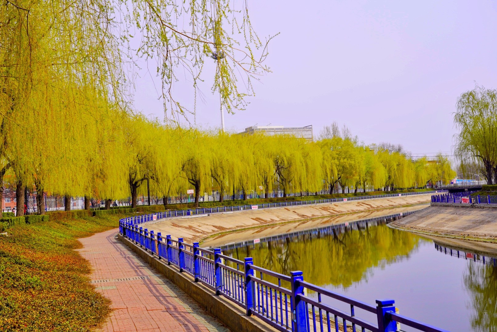 路人在垂柳吐绿的河边散步。白怀胜 摄
