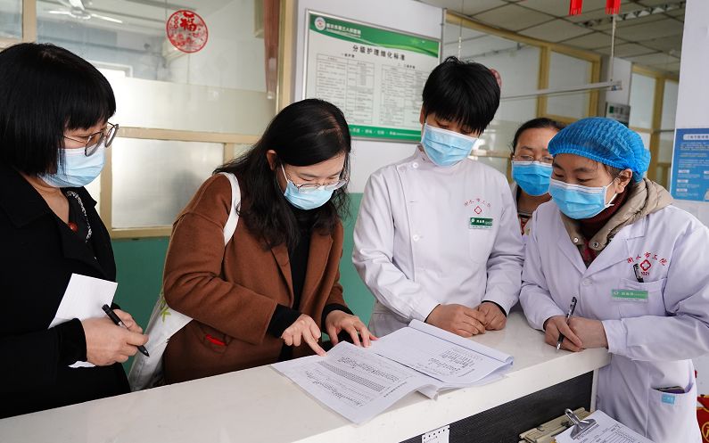 督导组一行先后来到预检分诊、发热门诊,发热患者专用CT室、临床病区等重点区域,通过实地查看、查阅资料、现场询问等方式,对预检分诊发热病人登记,门诊“一医一患一诊室”,发热门诊的流程布局和医护人员个人防护,发热患者专用CT使用和终末消毒、登记,病区封闭式管理,病区缓冲病房使用,住院患者及陪护人员核酸检测,病区防护物资储备情况进行了全面督导检查。