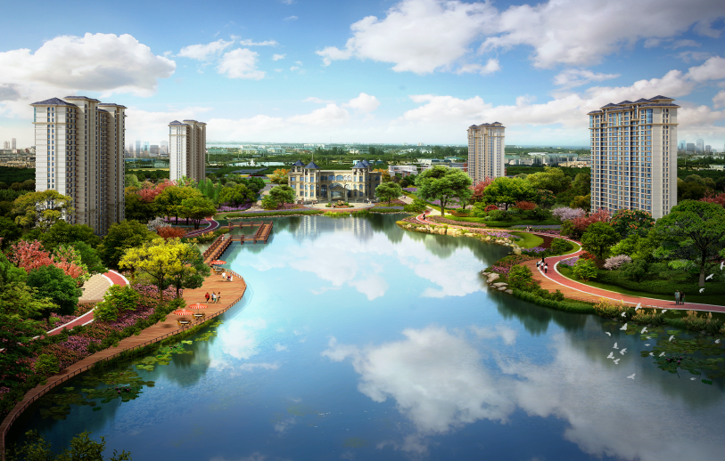 小区地面以高贵的欧式花纹铺装散发浓郁建筑气息,从而形成一岸(吴公河景观带)、双核(两个组团主题式核心景观)、三公园(城市公园、社区公园、布袋公园)的设计布局,为业主营造出“三季有花,四季常绿”的优美绿化环境。