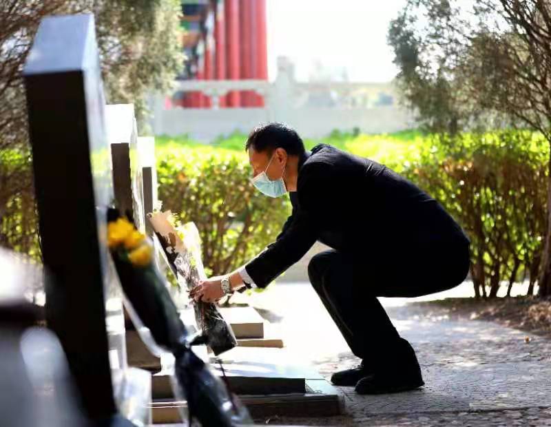沿着笔直的小路,穿过成荫的树林,映入眼帘的是庄严肃穆的烈士墓区,每一个被擦得铮亮的墓碑前都放着一束黄菊。长眠于此的57名烈士,有38位有名烈士,19位无名烈士。彭辉告诉记者,近几年受疫情影响,陵园先后闭园、限流、不接待团体祭扫,一些外地的烈士亲属无法到陵园祭奠亲人。为此,陵园主动联系每一位烈士亲属,为无法到陵园祭扫的烈士亲属提供以擦拭一遍墓碑、敬献一束鲜花、打一个慰问电话为内容的代祭扫服务,在大力弘扬英烈精神的同时为烈士亲属带去温馨和慰藉。