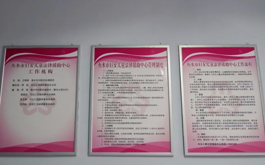 衡水市妇女儿童法律援助中心是衡水市妇联建立管理的,工作地点设在市妇联,配备专职律师3名,实行坐班制度。工作职责上除了为妇女儿童提供免费的法律咨询、代写法律文书外,还为合法权益受侵害的经济困难的妇女、儿童提供法律援助。援助案件为符合《中华人民共和国法律援助法》及《河北省法律援助条例》规定的援助案件,主要包括人身安全保护令案件、平等就业权纠纷、性骚扰损害赔偿纠纷等就业性别歧视劳动争议案件、婚姻家庭纠纷案件等妇女儿童权益类的案件。
