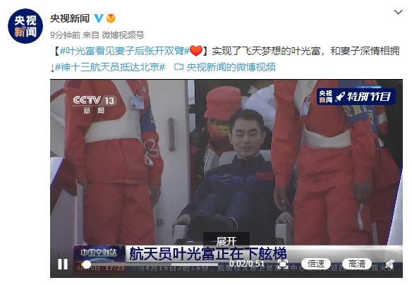 【叶光富看见妻子后张开双臂】实现了飞天梦想的叶光富,和妻子深情相拥。