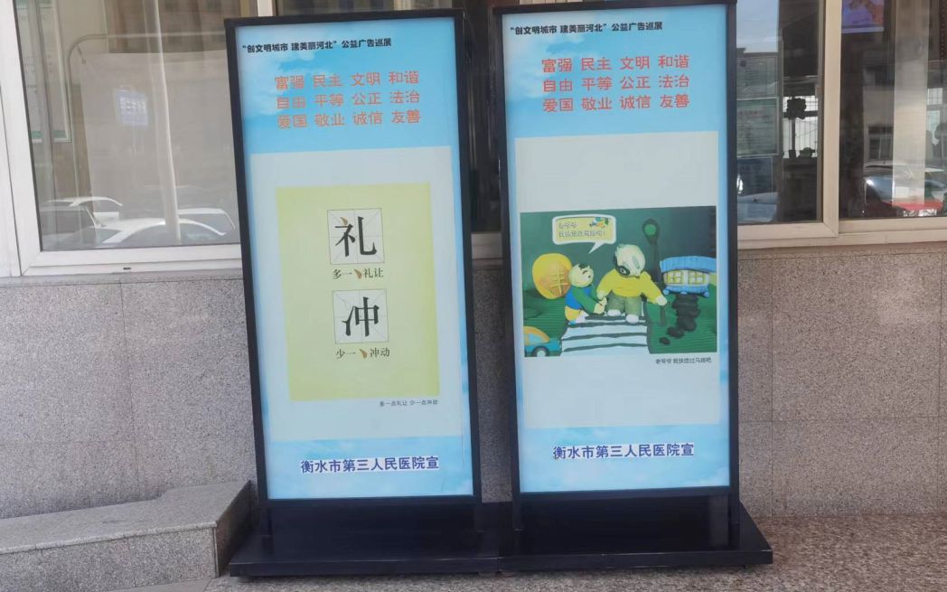 医院不断丰富文化建设内涵,把“厚德 精诚 创新 奉献”的院训融入医疗行为规范,充分利用院内人流量大的特点,将公益广告播放与群众教育相结合,门诊楼内电子大屏播放文明短片,墙面、立柱、电梯等醒目部位张贴创建公益海报,内容涵盖社会主义核心价值观、讲文明树新风、图说我们的价值观、法治精神、文明交通、文明礼仪、家风家教等各方面内容,教育引导医院职工和广大群众养成良好的文明生活习惯,自觉遵守社会公德,提高自身品格和素质修养。