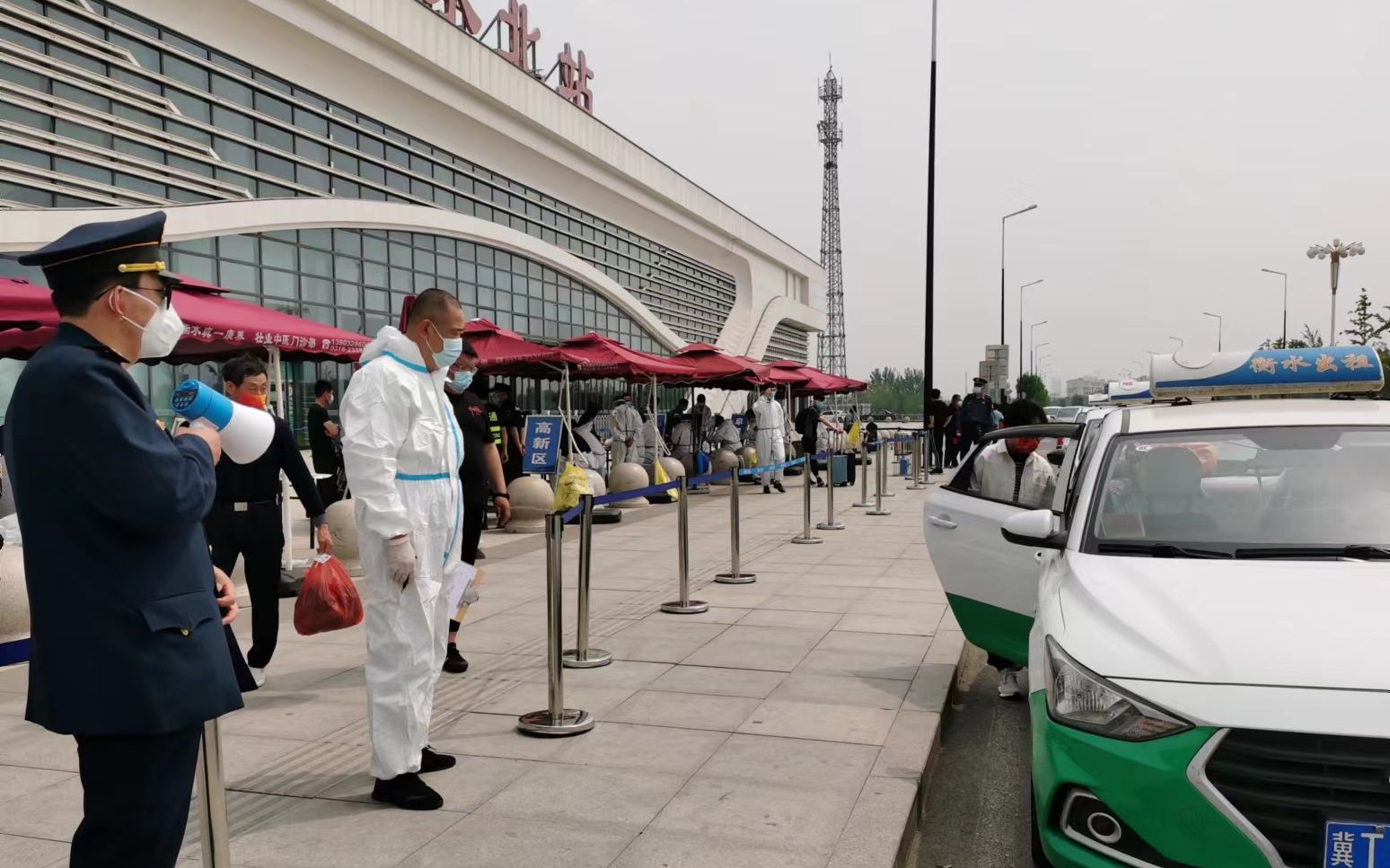 “您好,请大家排队保持一米间隔,做好信息登记!”“乘坐出租车的旅客请从西口上车,自行离开的请走南口”……当天上午,在衡水火车站登记区,工作人员正维护现场秩序。记者在现场看到,登记区安装了护网隔离,实行封控管理,设有两个出口,南门为乘坐私家车或自行离开出口,西门为乘坐出租车出口,每个出口都有执法人员负责引导旅客。一旁的候车区内,参加“点对点”运输的出租车正排队等待旅客上车。“全副武装”的出租车驾驶员陈英杰告诉记者,为了减少疫情传播风险,政府部门为他们配备了防护服等全套防护装备,他们对车辆进行“一车次一消毒”,行车过程中尽量选最优路线、用最少时间、走最短路程,将旅客直接送达目的地,中途不再上下客,确保疫情不会通过运输环节传播。