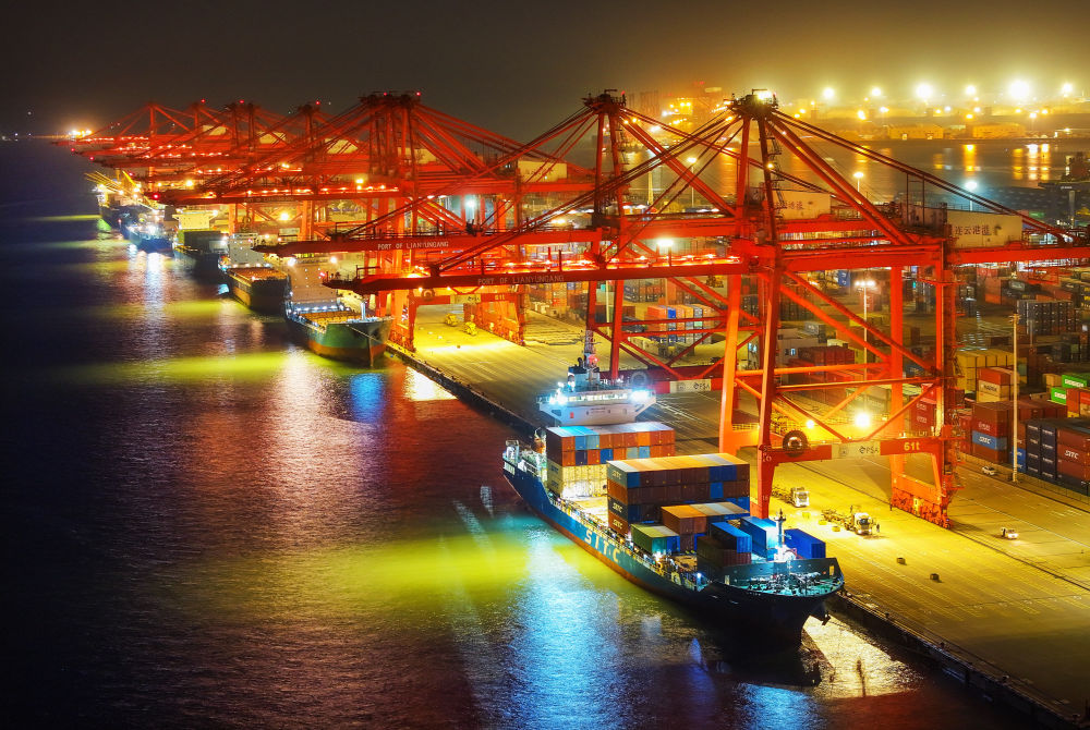巨轮靠泊,岸桥伸缩,洋浦国际集装箱码头一派繁忙。