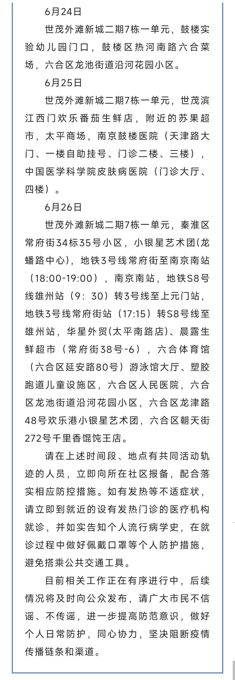 6月27日,南京市先后接外省协查通报,有两名核酸检测阳性人员曾在南京市有旅居史,两人系同住家庭人员。接报后,市、区两级立即启动应急处置机制,迅速对其在宁涉及场所实施临时管控措施,对密接人员进行排查管控。目前已发现4名密切接触者(均系阳性人员家庭成员)核酸检测结果异常。根据已掌握流调信息,相关人员在宁活动主要涉及以下场所: