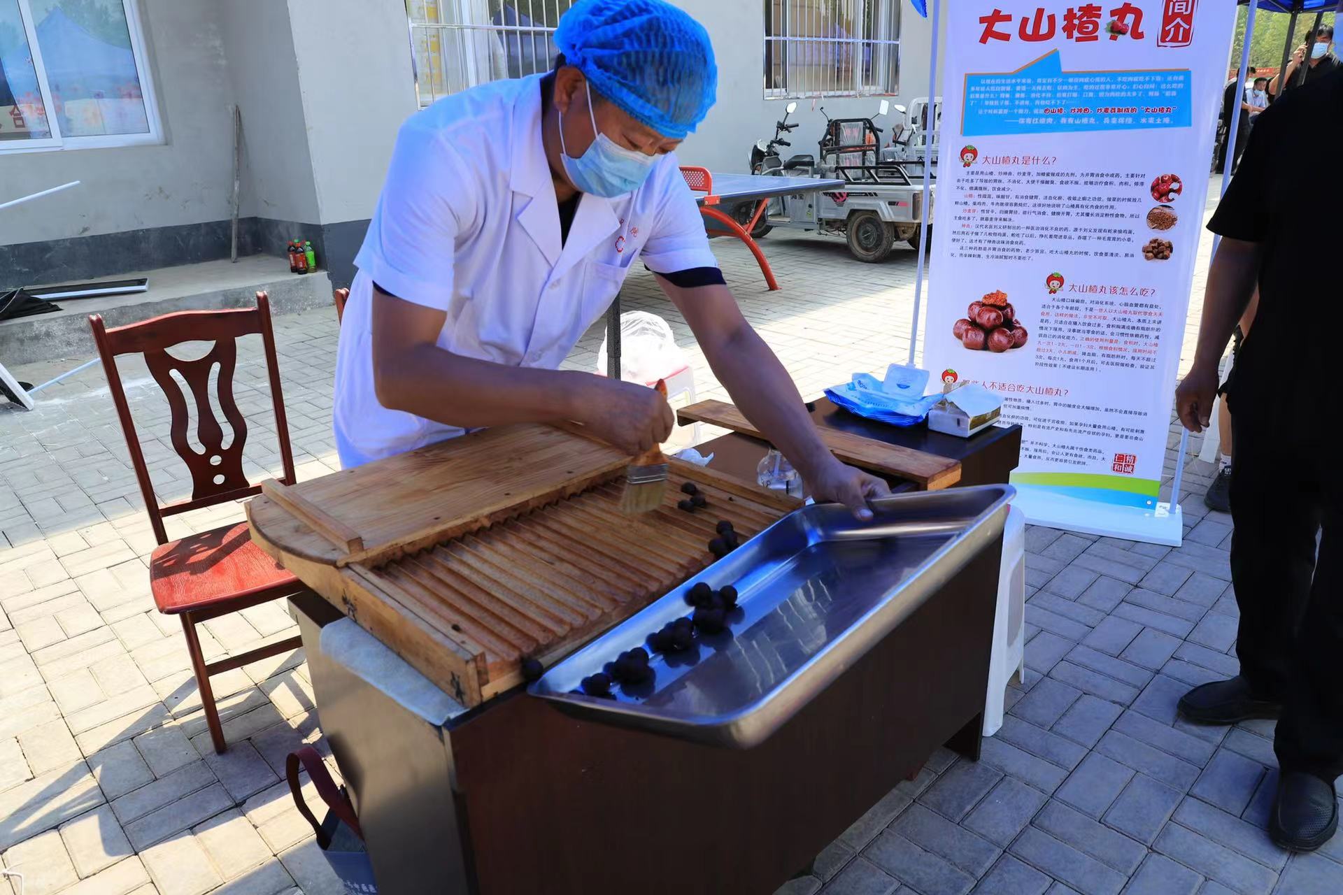 考虑到夏季天气炎热,市中医医院中药房、制剂室的中药师提前熬制解暑的“雪菊冰糖茶”,免费提供给大家饮用,还组织老药工现场用中药材和传统器具制作“大山楂丸”,免费让乡亲们服用。
