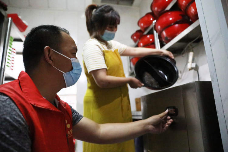 邢台市任泽区餐厨垃圾收集站的工作人员在指导当地商家使用油水分离设备。(受访单位供图)