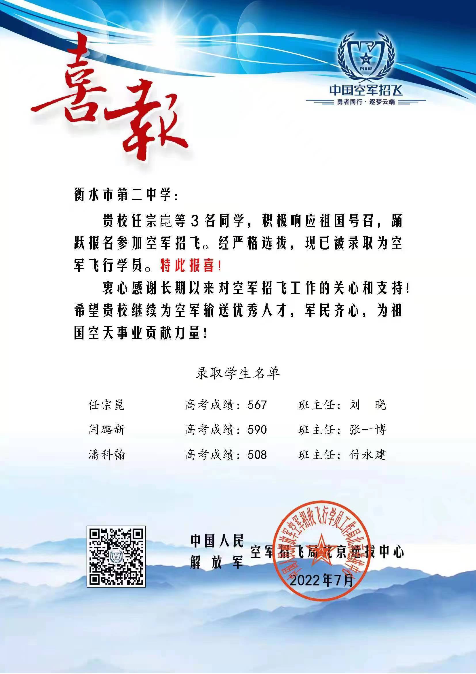 长空寄梦想,空天铸辉煌! 任宗崑、闫璐新、潘科翰3位同学凭借卓越的身体素质和突出的高考成绩,在层层严格筛选中脱颖而出,最终被选定为“蓝天卫士”,充分体现了衡水二中长期坚持“超越永无止境”的校训精神、扎实推进素质教育的杰出成果。今后,衡水二中将继续坚持自身教育特色,注重学生综合素质提升,力争以更加优质的教育为国防事业和国家建设输送更多优秀人才。