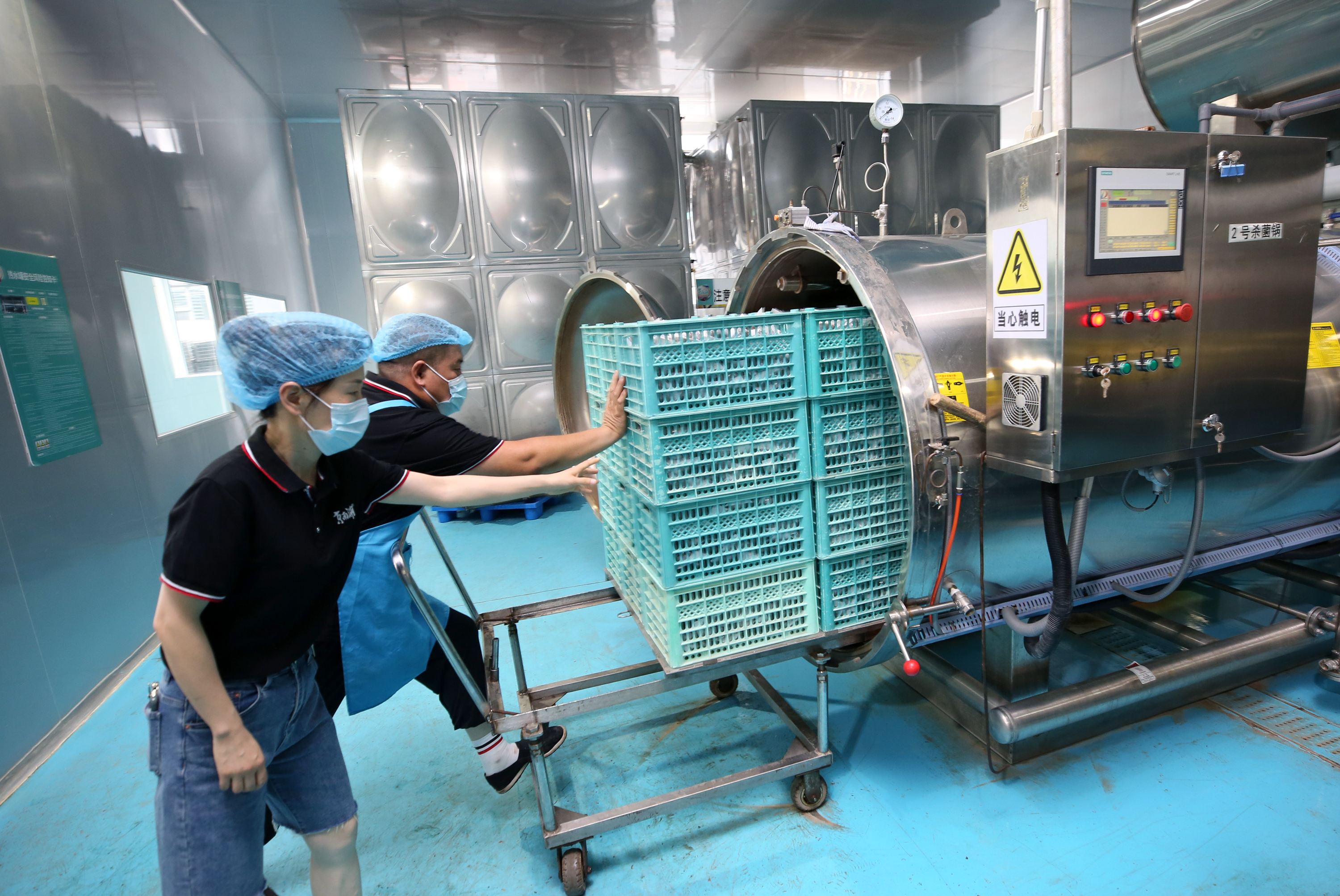加工车间内,一台台大型现代化自动设备,一道道先进、繁琐、考究的生产工艺,令人啧啧称奇。袁站磊介绍,要烤制出焦香油多、健康美味的鸭蛋,需要经过腌制、清洗、分选、蒸烤、真空包装、灭菌等11道工序。“泥腌鸭蛋需要温度控制在22°C至24°C之间,静置40天左右;在蒸烤锅需进行185分钟特定温度的蒸烤;为了保质期更长,鸭蛋真空包装后还需121°C高温持续杀菌30分钟……”说起工艺,袁站磊滔滔不绝。而这些工艺的完成,离不开成套的先进设备——全自动洗蛋机,每小时可清洗3万枚鸭蛋;裂纹分选检测机,可通过光检、声波测试挑出裂纹蛋,自动称重后根据个头大小放入相应轨道;真空包装机,为鸭蛋进行真空包装……