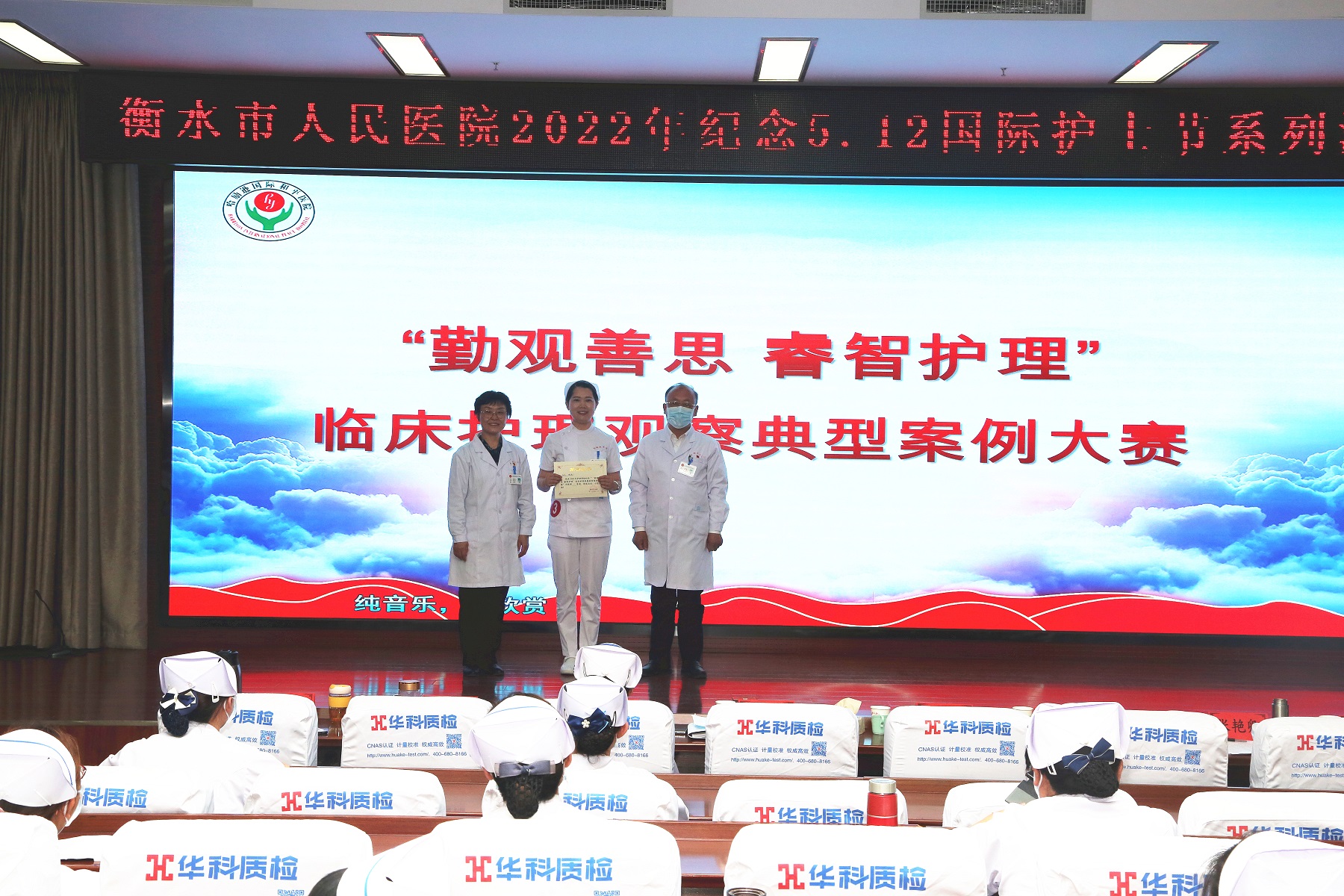 郑辉(右一)、曹双清为荣获一等奖的肾内科护士杜然颁奖。