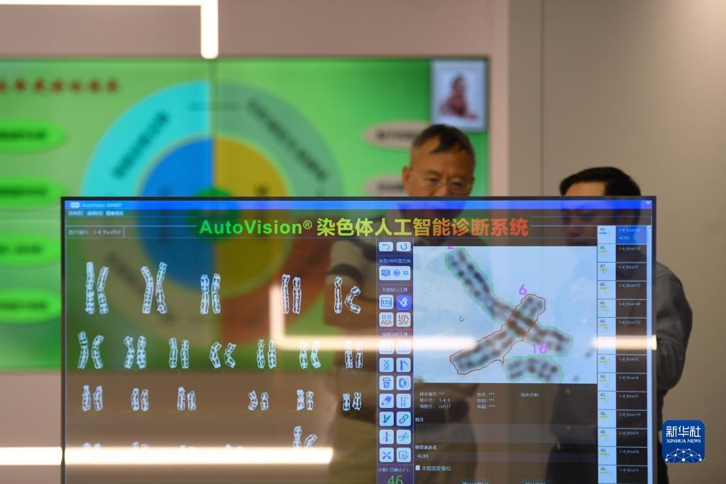 参加中国(杭州)数字·健康小镇开园仪式的嘉宾在小镇的成果转化区了解一套染色体人工智能诊断系统(2020年8月30日摄)。新华社记者黄宗治 摄