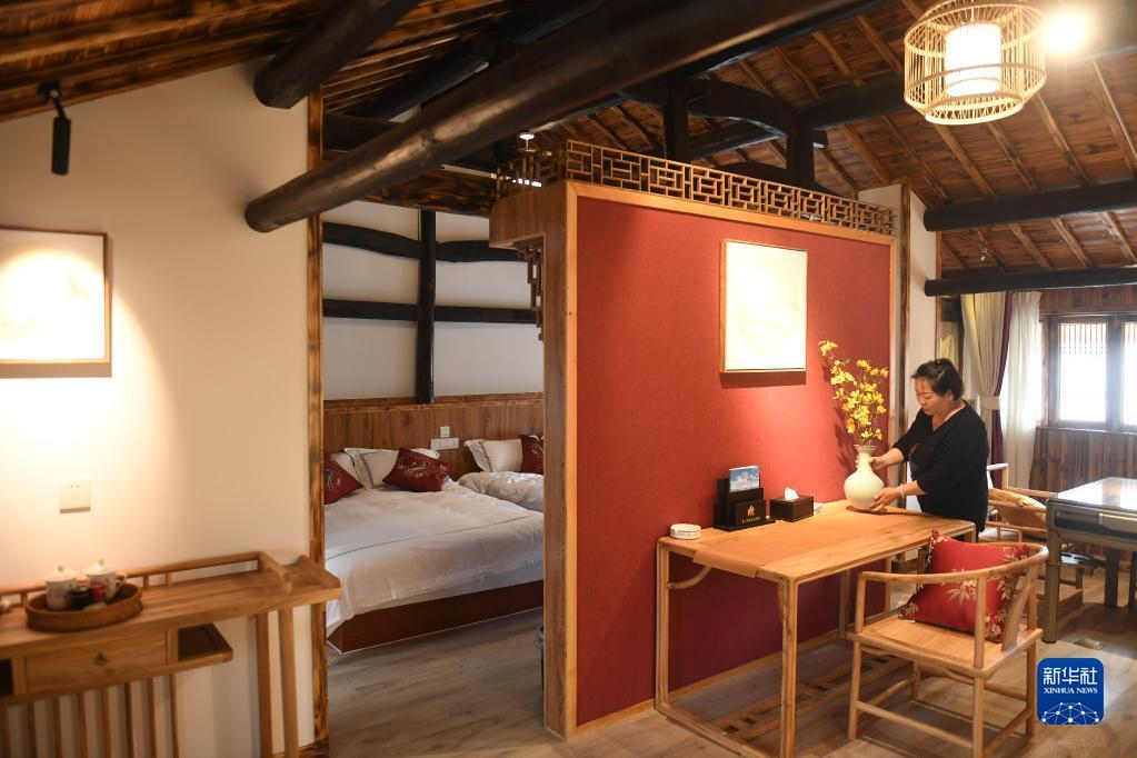 服务员在浙江省磐安县乌石村一家民宿内整理房间(2019年4月24日摄)。新华社记者翁忻旸 摄
