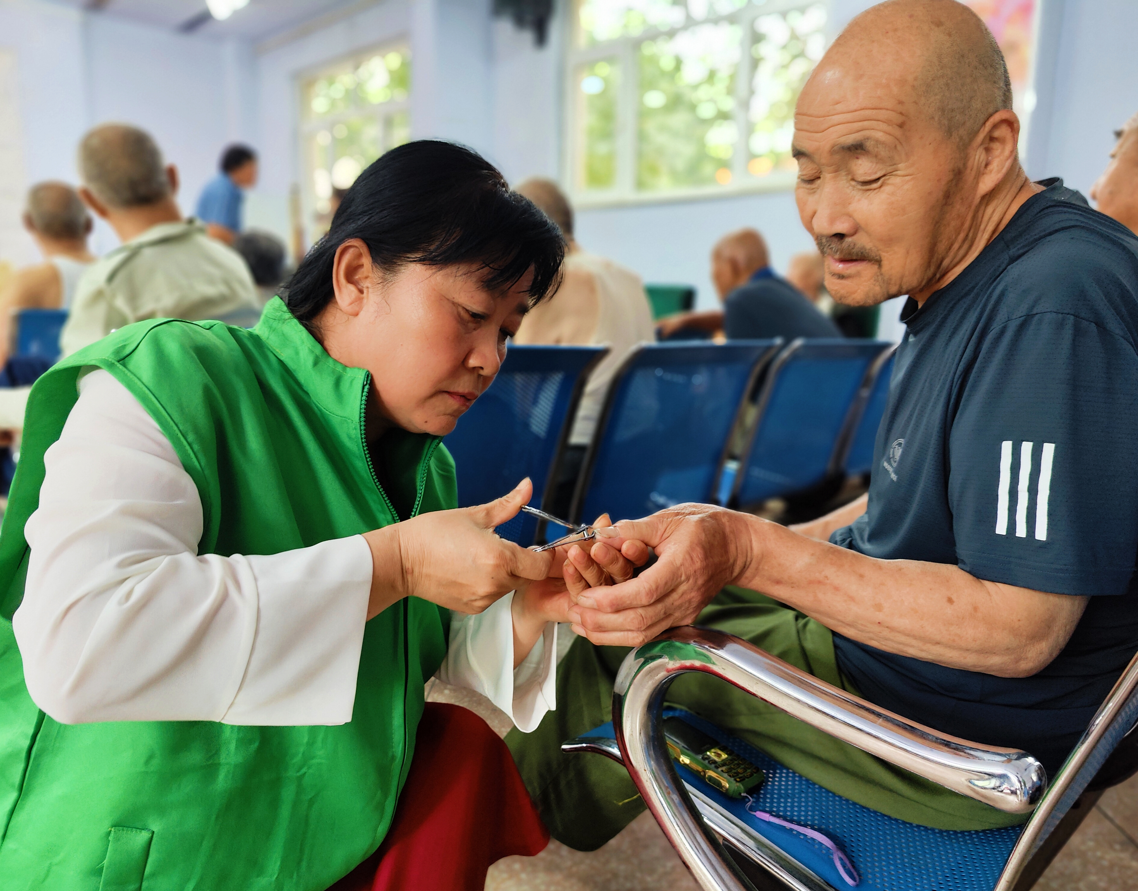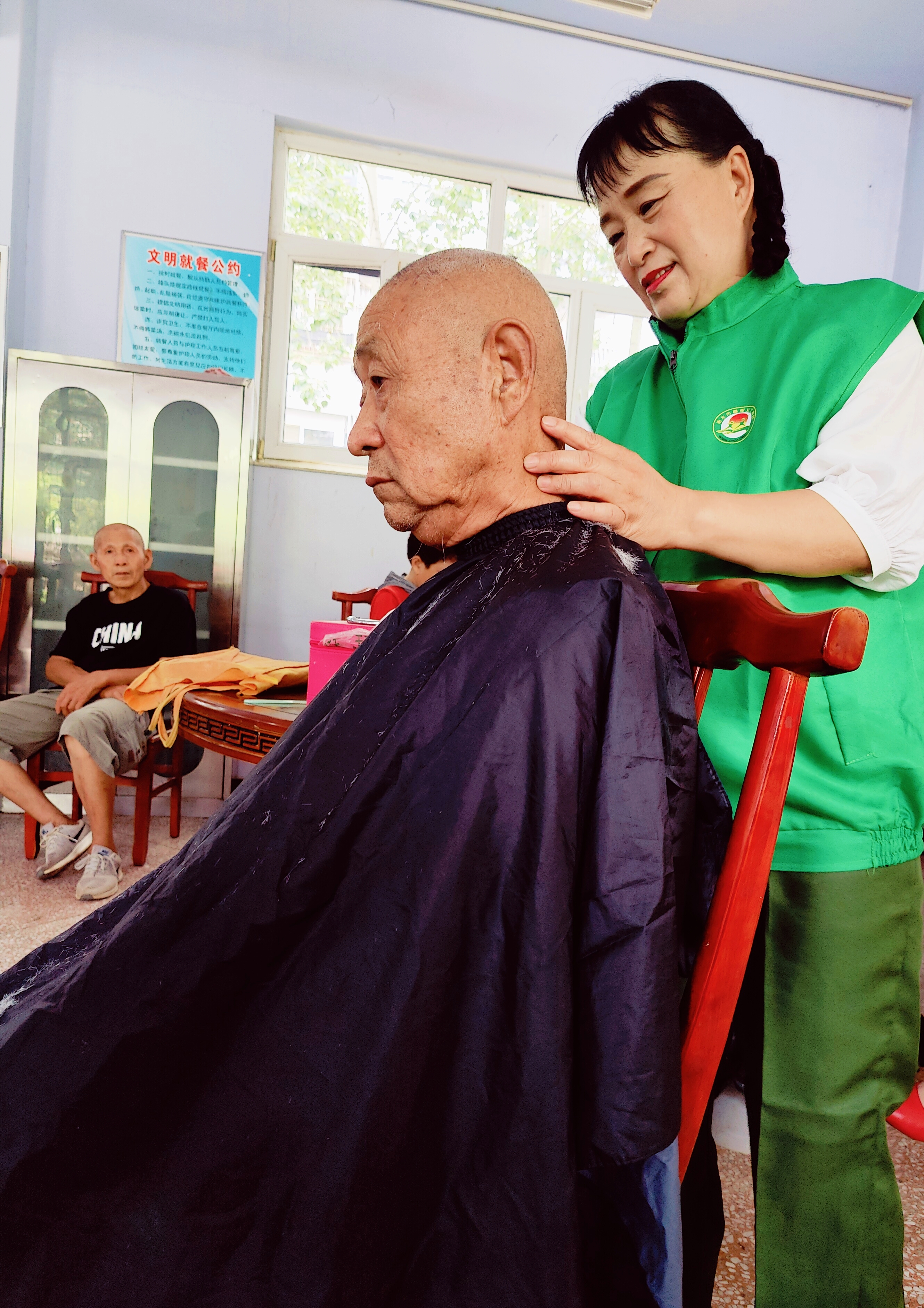 活动中,志愿者还为老人们理发、剪指甲,陪他们谈心,光荣院里处处都洋溢着节日的温馨氛围。