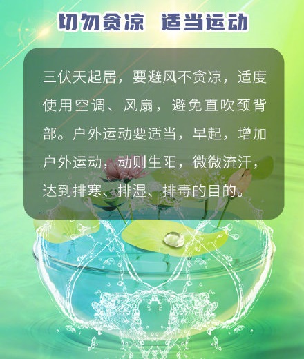 露脐装、冰淇淋、冲凉……这些都是夏天的标配。但你不知道的是,这些“标配”其实对身体会造成伤害。今天,中伏开始了,今年的中伏从7月26日-8月14日,是一年中暑热最盛的日子。俗话说“冷在三九,热在三伏”,我们怎样才能舒适健康地度过三伏天呢?三伏天又应该如何养生呢?
