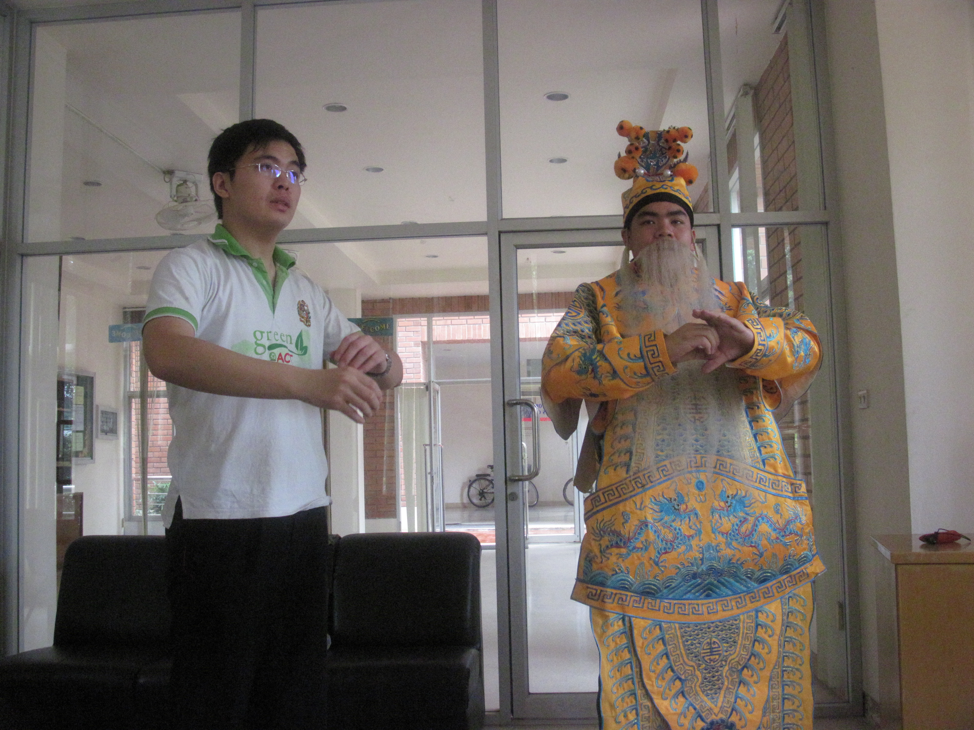 张忠谦儿子张迪(左)向外国友人传授京剧 资料图片