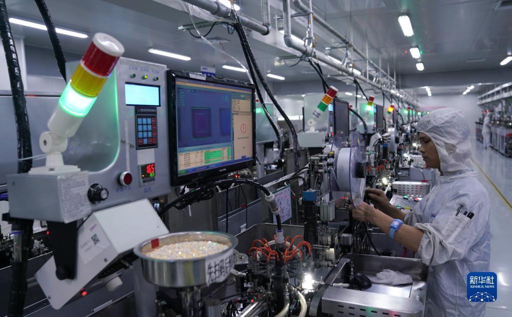 江西兆驰光元科技股份有限公司的工作人员在车间进行LED封装编带工序(2021年6月25日摄)。新华社记者胡晨欢 摄