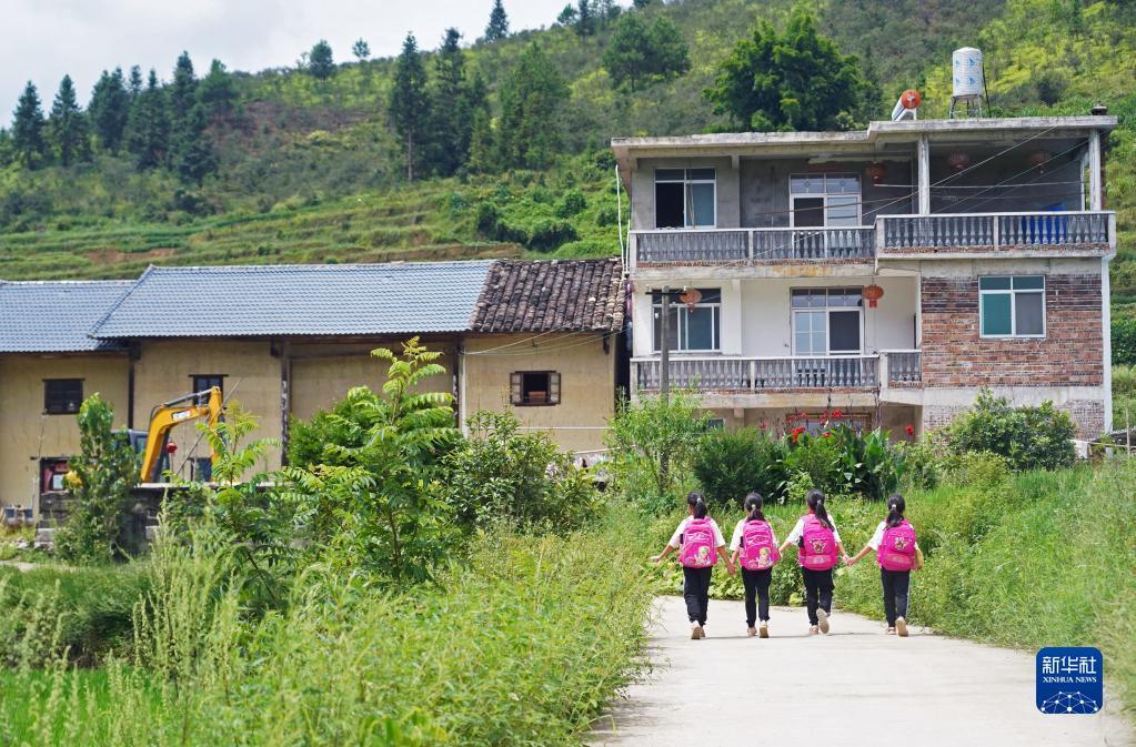 在江西省赣州市崇义县上堡乡上堡村,孩子们走在放学回家的路上(2020年9月10日摄)。远处是一户村民的土坯房祖屋和新建的三层小楼。新华社记者万象 摄