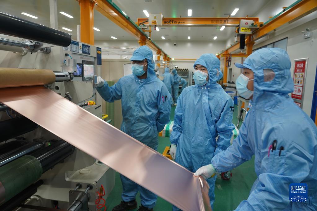 在位于江西南昌高新区的江铜耶兹铜箔有限公司,工人进行锂电铜箔分切工序(2022年5月12日摄)。新华社记者周密 摄