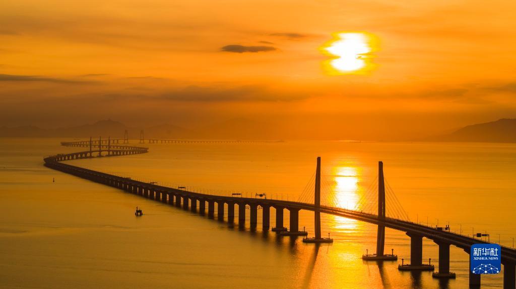 港珠澳大桥海上日出(2019年8月7日摄,无人机照片)。新华社发