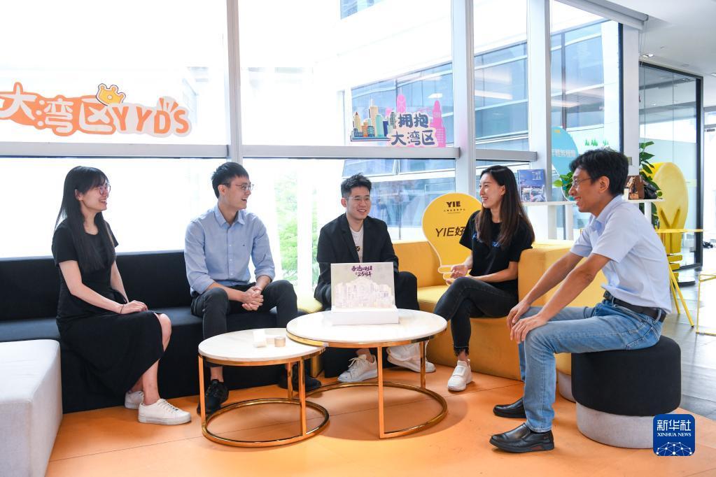 在位于深圳市的前海深港青年梦工厂,香港创业青年们一起交流各自的创业项目(2022年6月20日摄)。新华社记者 梁旭 摄