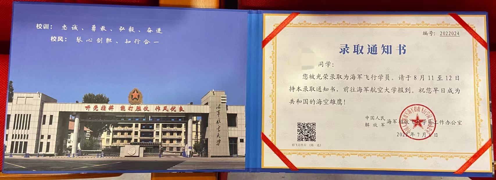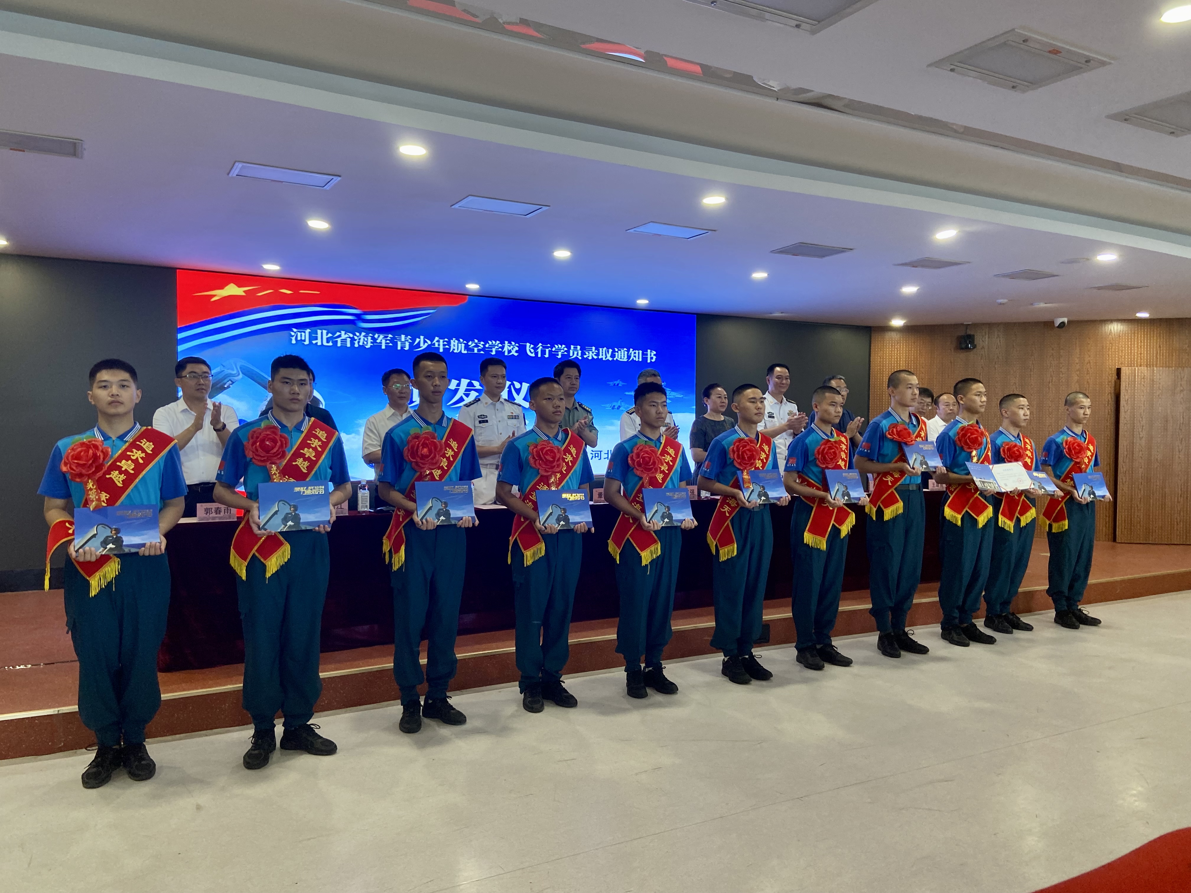 11名被录取的衡水籍海军飞行学员身披绶带,胸戴红花,喊着整齐响亮的口号,昂首挺胸走上主席台,接过了沉甸甸的录取通知书。3年前,他们抱着飞天巡海的梦想,从全省2000多位报名者中经过层层筛选。3年间,他们经过一轮又一轮选拔、淘汰,通过艰苦的体能训练和文化课学习,经历了身体全方位的严苛检查、心品测试、政治审核后,凭借优异的高考文化成绩,最终脱颖而出,顺利录取为中国人民解放军海军航空大学飞行学员,得以冲击“海天梦想”。