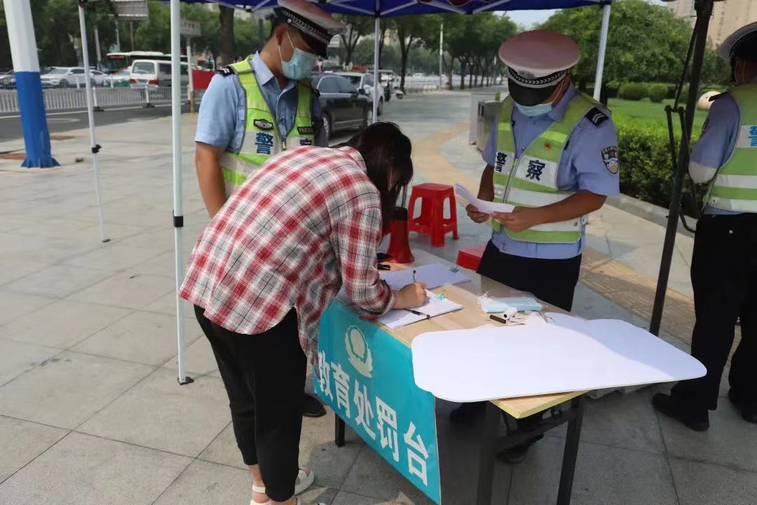 当日上午10时许,记者在胜利路与育才大街交叉口看到,6名执勤交警头顶烈日,正在开展路面执法整治行动,对不佩戴安全头盔的电动自行车驾驶人实行扫码登录电动车违法处理APP进行登记,对电动自行车未登记上牌及未佩戴安全头盔的市民严格落实“三招不过岗”管理规定,即采取转发朋友圈积赞、抄写交通法规、在路口举提示牌警示他人“三选一”的处罚方式。忙碌中,他们还不忘提醒过往市民遵守交通规则,文明安全出行。
