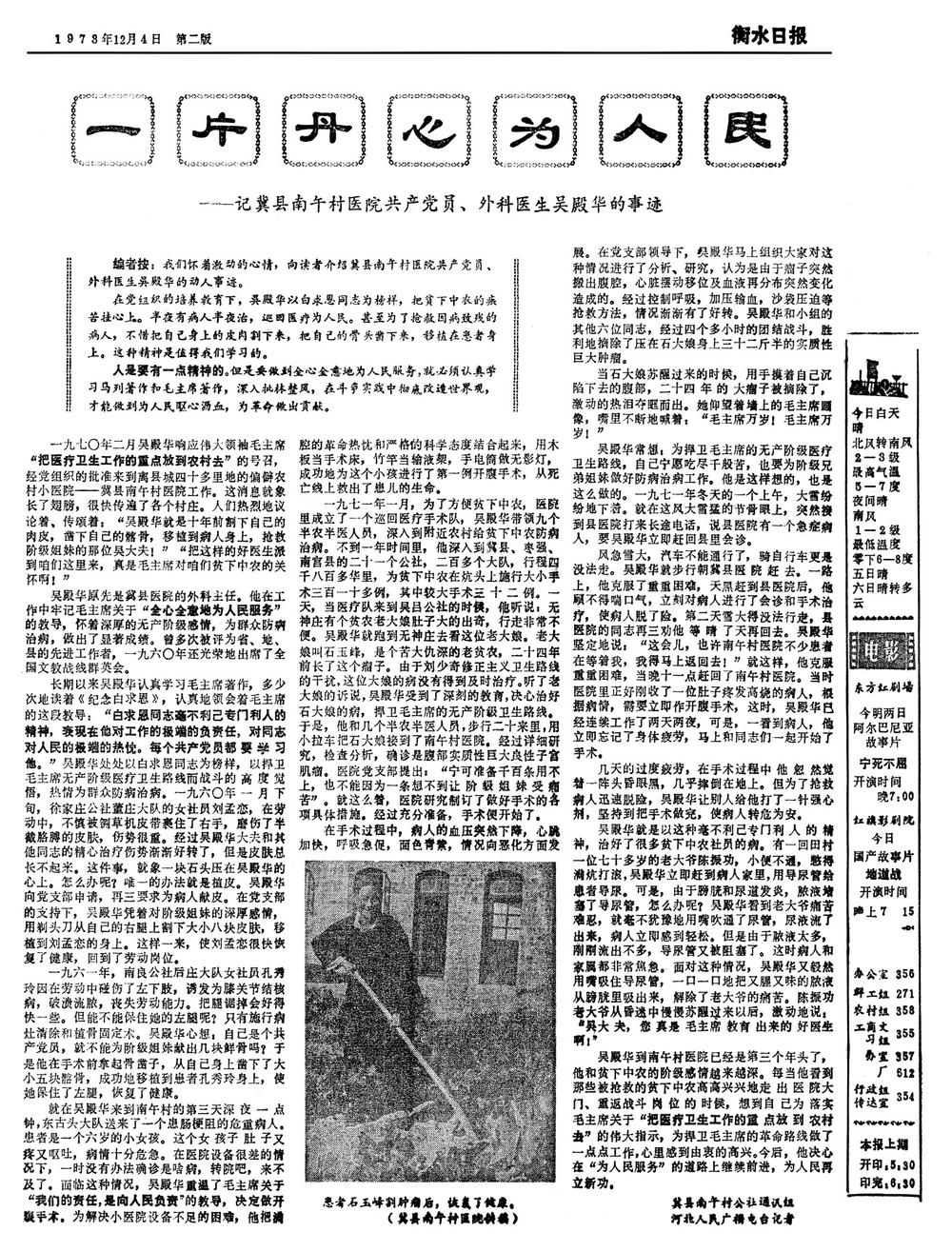 “为了抢救因病致残的病人,不惜把自己身上的皮肉割下来,把自己的骨头凿下来,移植在患者身上。这种精神是值得我们学习的。”1973年12月4日,《衡水日报》刊发整版文章《一片丹心为人民》。编者按中,编辑“怀着激动的心情”,向读者介绍了吴殿华的动人事迹——