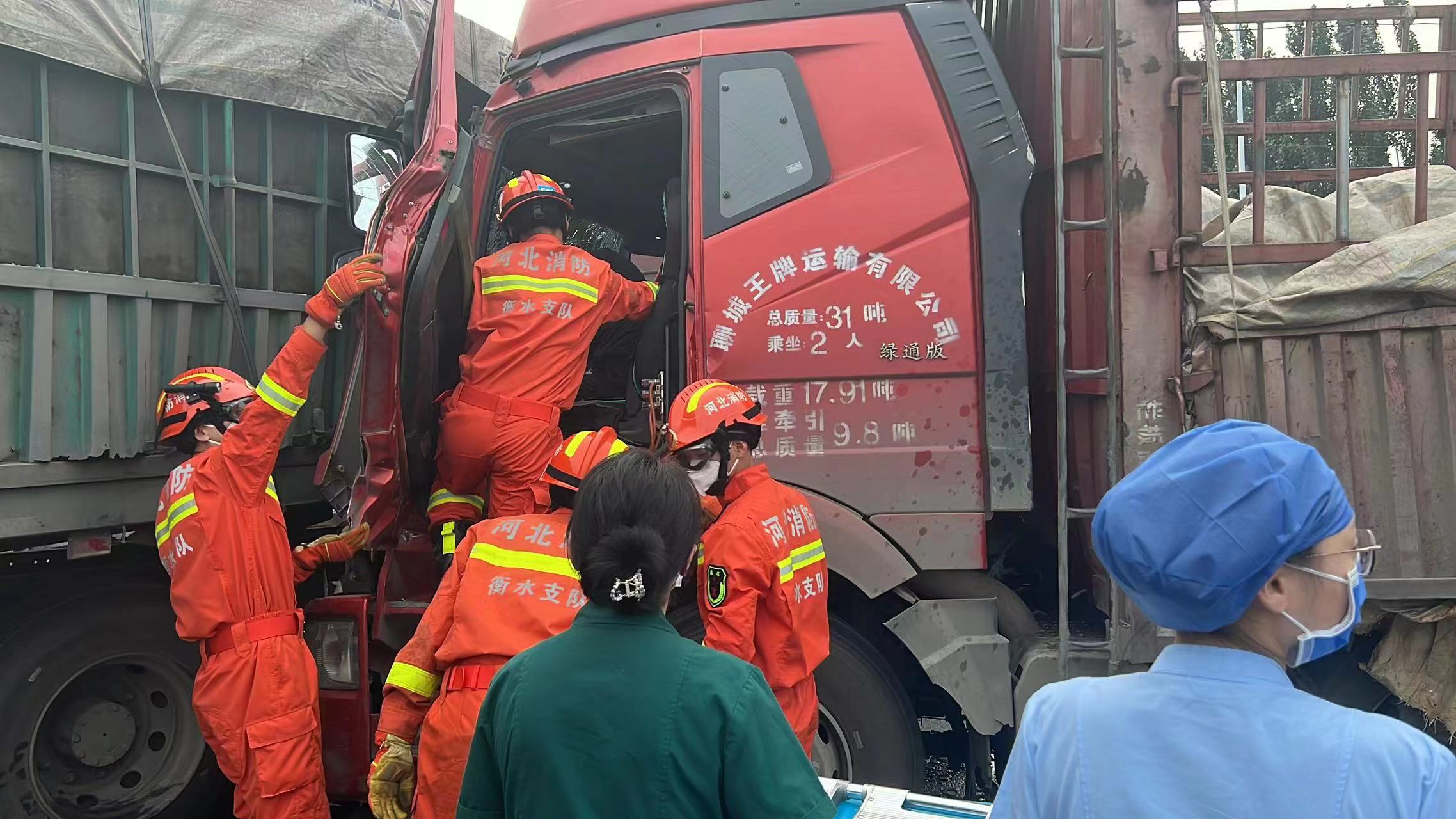 8月18日凌晨,衡水高新区消防救援大队振华新路消防救援站接到报警称,位于高新区衡井线与振华路交叉口两货车相撞,振华新路消防救援站共出动2车共13名消防指战员前往现场处置。